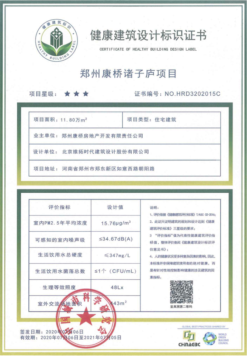 △康橋諸子廬榮膺三星級健康建筑認(rèn)證住宅項目 ▲ 三星級健康建筑 中國健康人居最高級別認(rèn)證