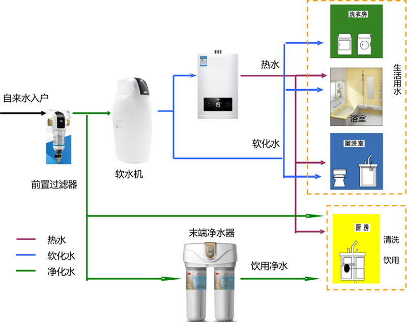 △全熱交換戶式新風(fēng)除霾系統(tǒng)示意圖 全屋凈、軟水系統(tǒng),通過前置過濾器、戶內(nèi)中央軟水機(jī)、末端凈水器,對生活供水分級處理、層層過濾,去除水中有害物質(zhì),讓用水更放心,生活更舒心。