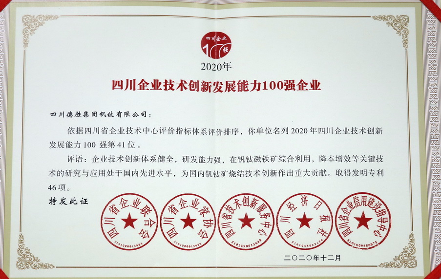 德勝釩鈦連續(xù)四年位列四川企業(yè)技術(shù)創(chuàng)新發(fā)展能力100強(qiáng),成為在技術(shù)創(chuàng)新協(xié)同發(fā)展中優(yōu)秀企業(yè)典型和四川技術(shù)創(chuàng)新優(yōu)秀企業(yè)品牌,不僅讓德勝釩鈦清晰認(rèn)識(shí)到的技術(shù)創(chuàng)新水平和行業(yè)地位,找準(zhǔn)差距,繼續(xù)奮進(jìn),同時(shí)也提升了德勝釩鈦品牌形象和競(jìng)爭(zhēng)力,進(jìn)一步擴(kuò)大了德勝釩鈦的影響力。