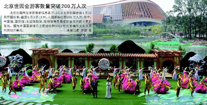 北京世園局發(fā)布的最新信息顯示,2019北京世園會自4月29日開園以來,截至6月9日18時(shí),入園游客達(dá)到206萬人次,其中,中國館、國際館、生活體驗(yàn)館、植物館等是最受游客歡迎的主要游覽地。圖為中國國家館日主題活動和2019年北京端午文化節(jié)系列活動開幕式。 本報(bào)記者 余波 攝