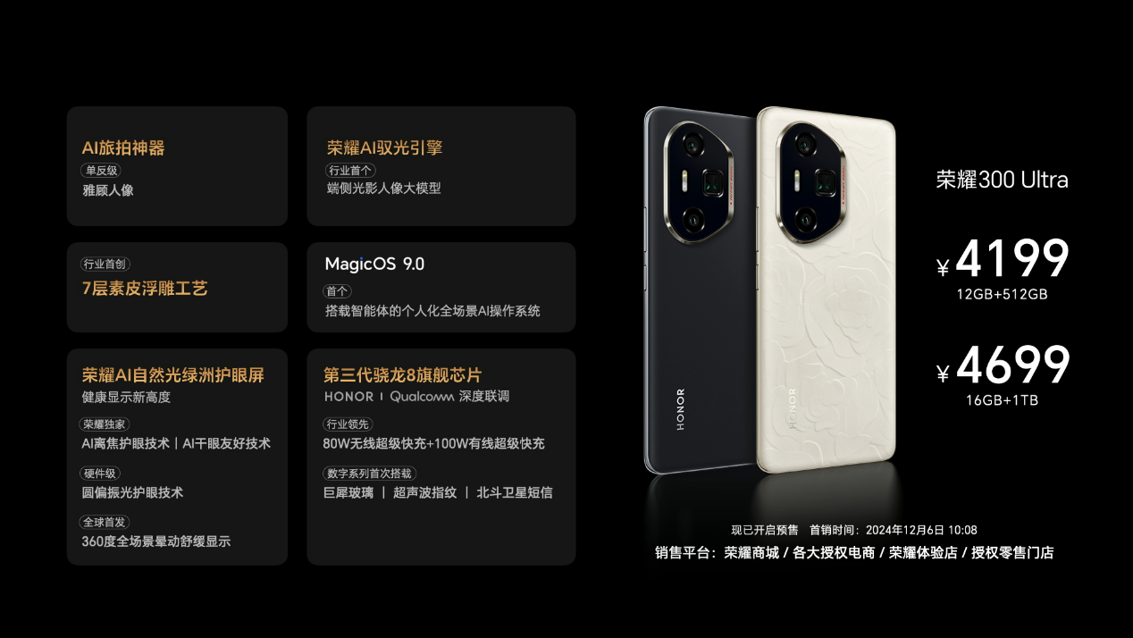 2024年12月2日,在榮耀300環(huán)球旅拍新品發(fā)布會(huì)上,AI旅拍神器榮耀300系列驚艷亮相。作為科技與美學(xué)融合的榮耀數(shù)字系列最新一代產(chǎn)品,榮耀300系列迎來(lái)里程碑式升級(jí)。首次引入U(xiǎn)ltra版本,攜手標(biāo)準(zhǔn)版與Pro版,共同構(gòu)建史上最強(qiáng)的榮耀數(shù)字系列產(chǎn)品矩陣,為用戶帶來(lái)超越期待的體驗(yàn)和選擇。