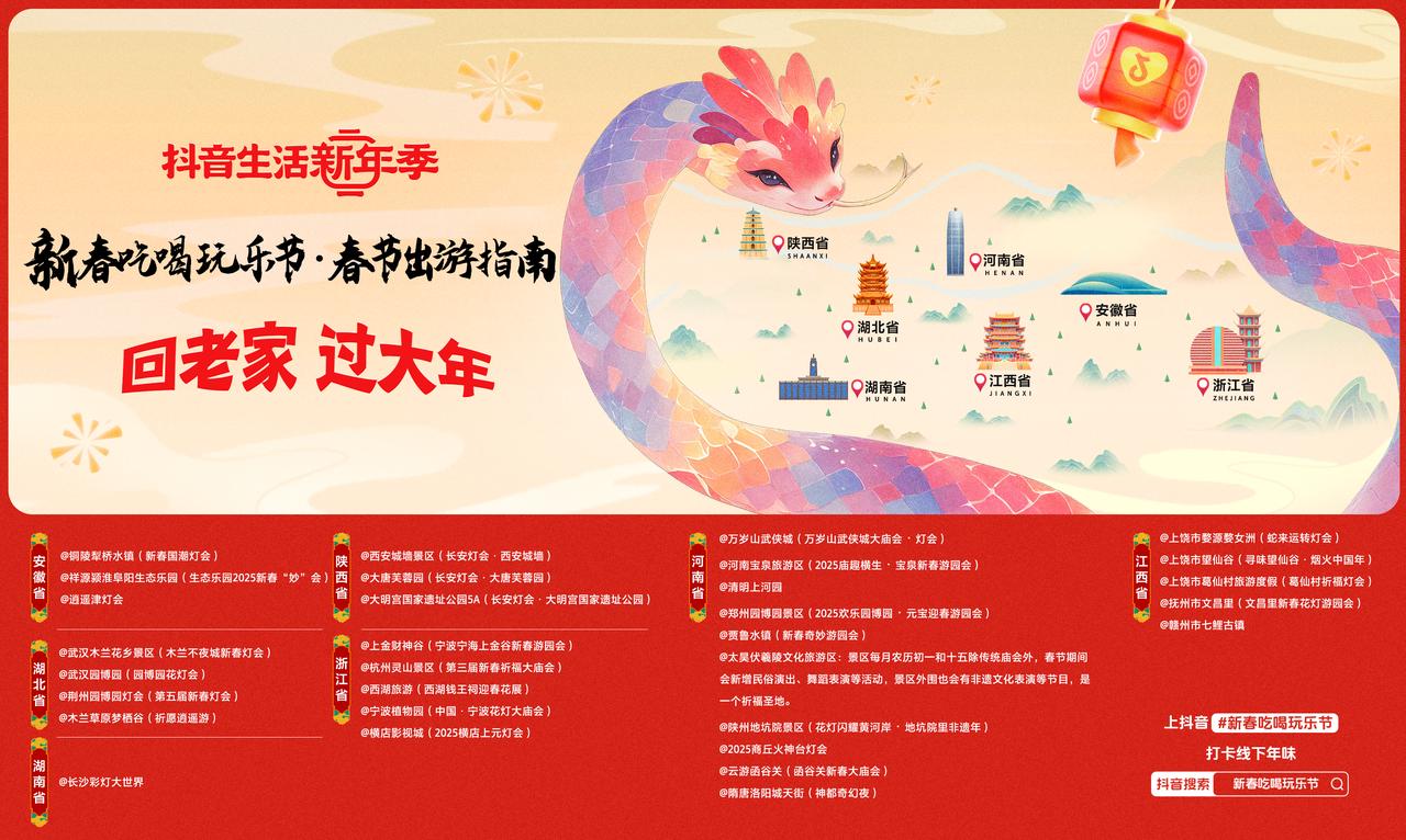 人間煙火處,年味漸濃時!城市的霓虹再耀眼,也比不上家鄉(xiāng)那盞為你長明的燈火,為了讓大家沉浸式體驗濃厚的年味,今年春節(jié)期間,「抖音生活新年季」聯(lián)合各類燈會、廟會商家,挖掘本地特色和家鄉(xiāng)歷史文化底蘊,通過特色玩法,聚集全國30余地區(qū)的年俗活動,打造「新春吃喝玩樂節(jié)·春節(jié)出游指南」手冊,點燃新春,與用戶一起分享家鄉(xiāng)好去處,共同開啟一個充滿歡樂的團圓之旅!