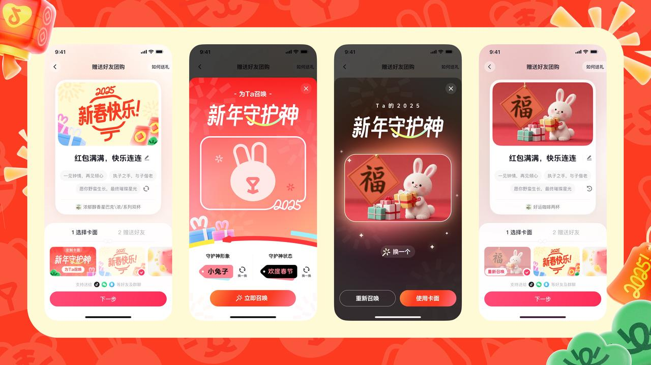 此外,抖音生活送禮玩法全面升級。1 月 24 日至 2 月 12 日期間,用戶團(tuán)購商品可一鍵 “贈送好友”,還能附上溫馨的新年祝福語,為好友精心選擇 “新年守護(hù)神形象” 與 “守護(hù)神狀態(tài)” ,獨(dú)特新穎的送禮卡面趣味十足。收到禮物的人還能使用預(yù)制專屬特效,拍攝 “炫耀視頻”,曬出朋友的心意,讓春節(jié)的儀式感拉滿。