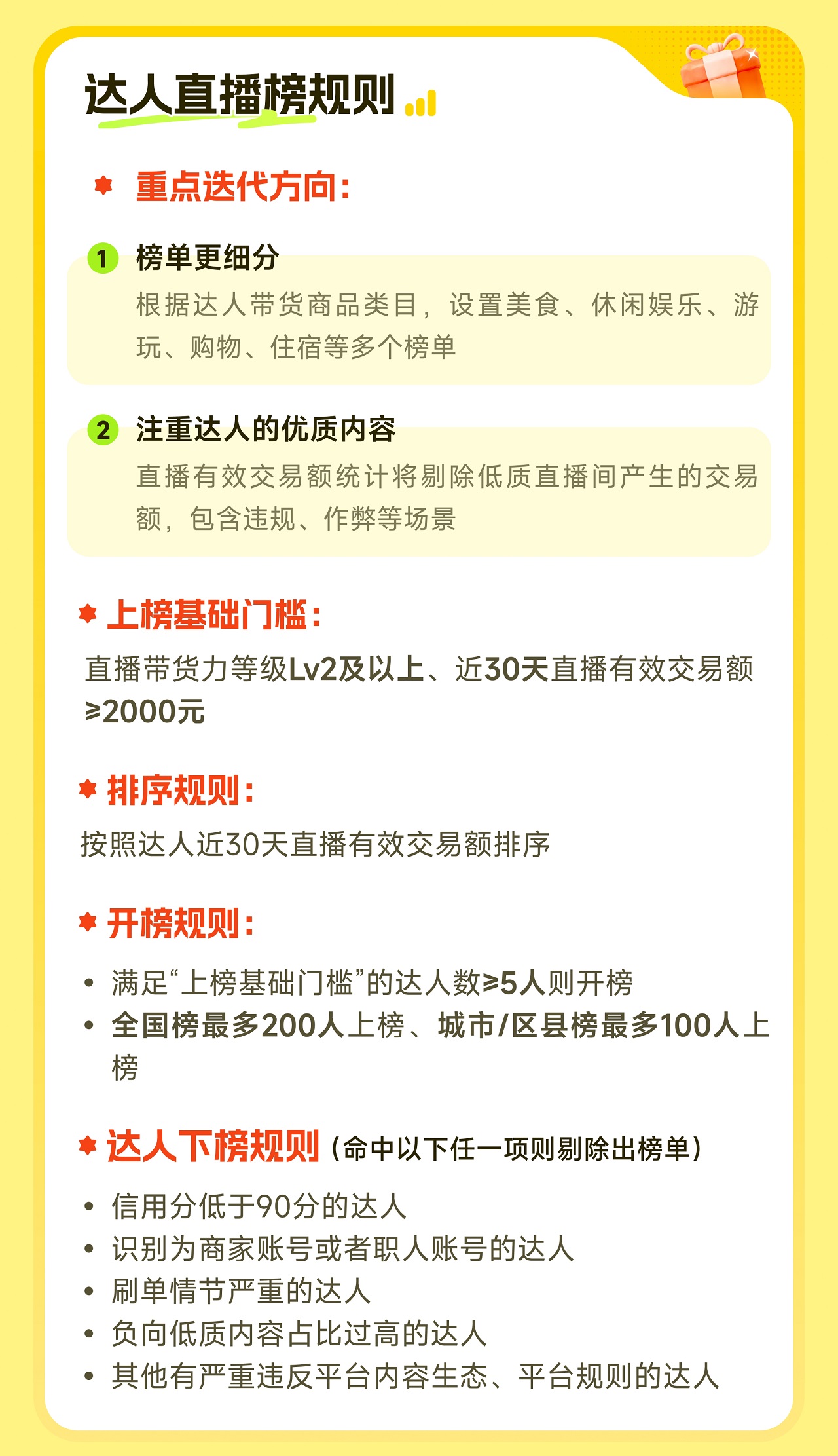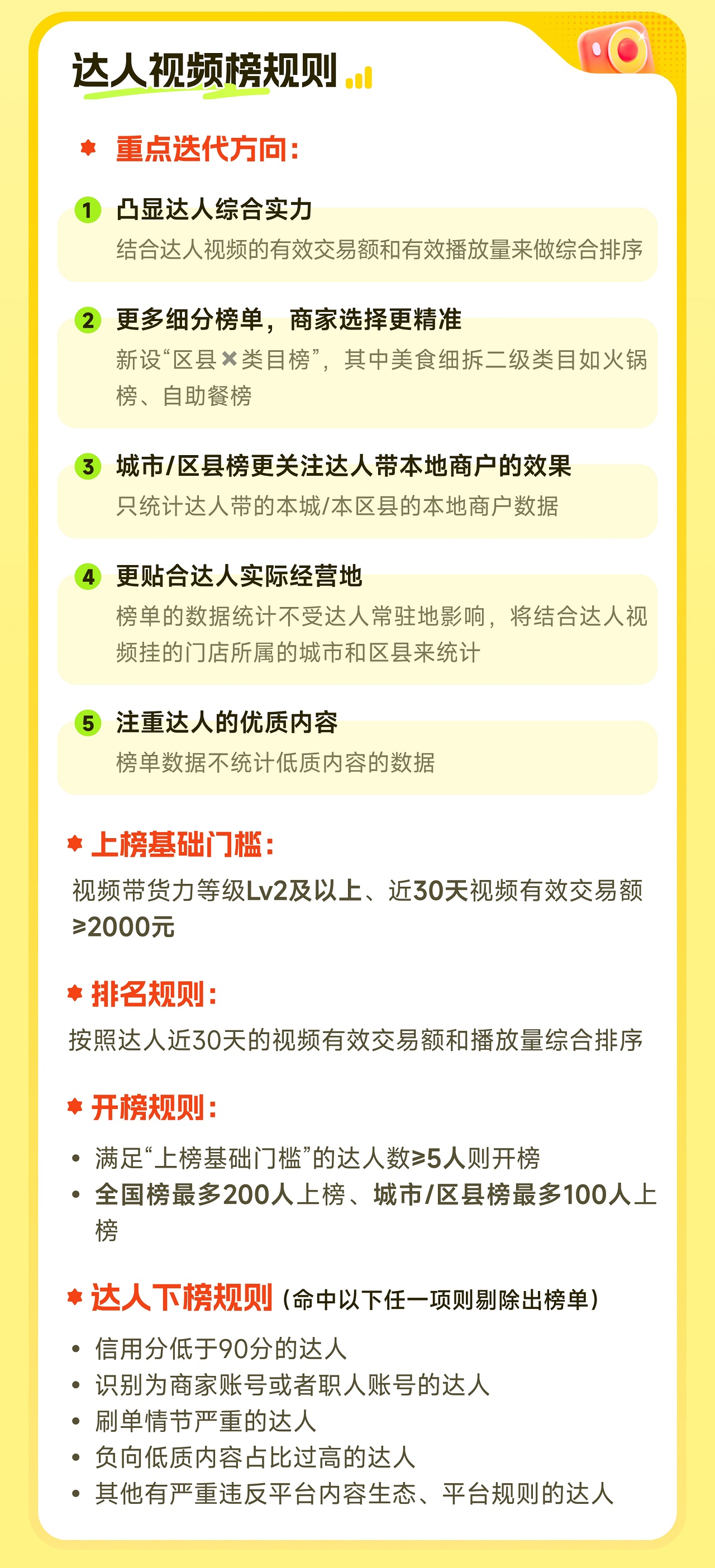 ·更凸顯達(dá)人綜合實(shí)力為提高榜單的認(rèn)可度,打造榜單的公信力,相較于舊榜僅結(jié)合有效交易額排序, 新榜單將綜合參考有效交易額、有效播放量來(lái)排序,更能凸顯達(dá)人的綜合實(shí)力。這一變化,將為專(zhuān)注內(nèi)容的達(dá)人創(chuàng)造更多機(jī)會(huì),為有內(nèi)容訴求的商家提供可靠的選人參考。·更多細(xì)分榜單,商家選擇更精準(zhǔn)為了給各區(qū)域不同賽道達(dá)人提供榮譽(yù)激勵(lì),幫助商家通過(guò)細(xì)分榜單更易找到適合自己的達(dá)人,更新之后的「達(dá)人視頻榜」設(shè)置了更多的細(xì)分榜單。 舊版的榜單,僅支持“上海美食榜”“北京酒旅榜”這類(lèi)“城市x行業(yè)榜”的呈現(xiàn)方式;更新后的榜單, 其展示形式細(xì)化到“區(qū)縣x細(xì)分類(lèi)目榜”的展示形式,其中美食賽道,還會(huì)細(xì)拆二級(jí)類(lèi)目。如:“上海徐匯區(qū)火鍋榜”“北京海淀區(qū)游玩榜”“上海普陀區(qū)燒烤榜”,更能體現(xiàn)達(dá)人在細(xì)分領(lǐng)域的經(jīng)營(yíng)情況。 ·城市/區(qū)縣榜,更關(guān)注達(dá)人帶本地商戶(hù)的效果在舊版榜單中,城市榜單會(huì)統(tǒng)計(jì)達(dá)人帶所有商戶(hù)的數(shù)據(jù),這就使得很多本地商家,有時(shí)較難在榜單中找到能帶本地商戶(hù)的達(dá)人。 為了幫助區(qū)域/城市商家提升選達(dá)人效率,也讓專(zhuān)注于帶本地商戶(hù)的達(dá)人有更多機(jī)會(huì)被看到,新榜單區(qū)分成兩種類(lèi)型,全國(guó)榜和城市/區(qū)縣榜: 其中全國(guó)榜統(tǒng)計(jì)達(dá)人帶所有商戶(hù)的數(shù)據(jù);而升級(jí)后的城市/區(qū)縣榜,僅會(huì)統(tǒng)計(jì)達(dá)人帶該城市/區(qū)縣本地商戶(hù)的數(shù)據(jù),大大提升了本地商戶(hù)在選擇達(dá)人時(shí)的精準(zhǔn)度。·更貼合達(dá)人實(shí)際經(jīng)營(yíng)地在過(guò)往,受限于達(dá)人常駐城市,達(dá)人上榜情況與達(dá)人重點(diǎn)經(jīng)營(yíng)城市不完全匹配。譬如,一個(gè)常駐北京的達(dá)人帶三亞的商戶(hù),會(huì)被統(tǒng)計(jì)到北京排行榜,三亞本地的商家可能在本地榜單中無(wú)法找到這位優(yōu)質(zhì)達(dá)人。 升級(jí)后, 榜單的數(shù)據(jù)統(tǒng)計(jì)將不受達(dá)人常駐地影響,會(huì) 結(jié)合達(dá)人視頻掛載的門(mén)店所屬的城市和區(qū)縣來(lái)統(tǒng)計(jì), 允許達(dá)人上多個(gè)榜。這不僅為商家的經(jīng)營(yíng)帶來(lái)更好的選人參考,跨區(qū)域經(jīng)營(yíng)的達(dá)人也有機(jī)會(huì)獲得更多商單。 ·注重達(dá)人的優(yōu)質(zhì)內(nèi)容升級(jí)后的榜單中, 負(fù)向視頻內(nèi)容數(shù)據(jù)將不計(jì)入到榜單的數(shù)據(jù)統(tǒng)計(jì)里, 如虛假素材、搬運(yùn)等,榜單更注重達(dá)人內(nèi)容的優(yōu)質(zhì)性。