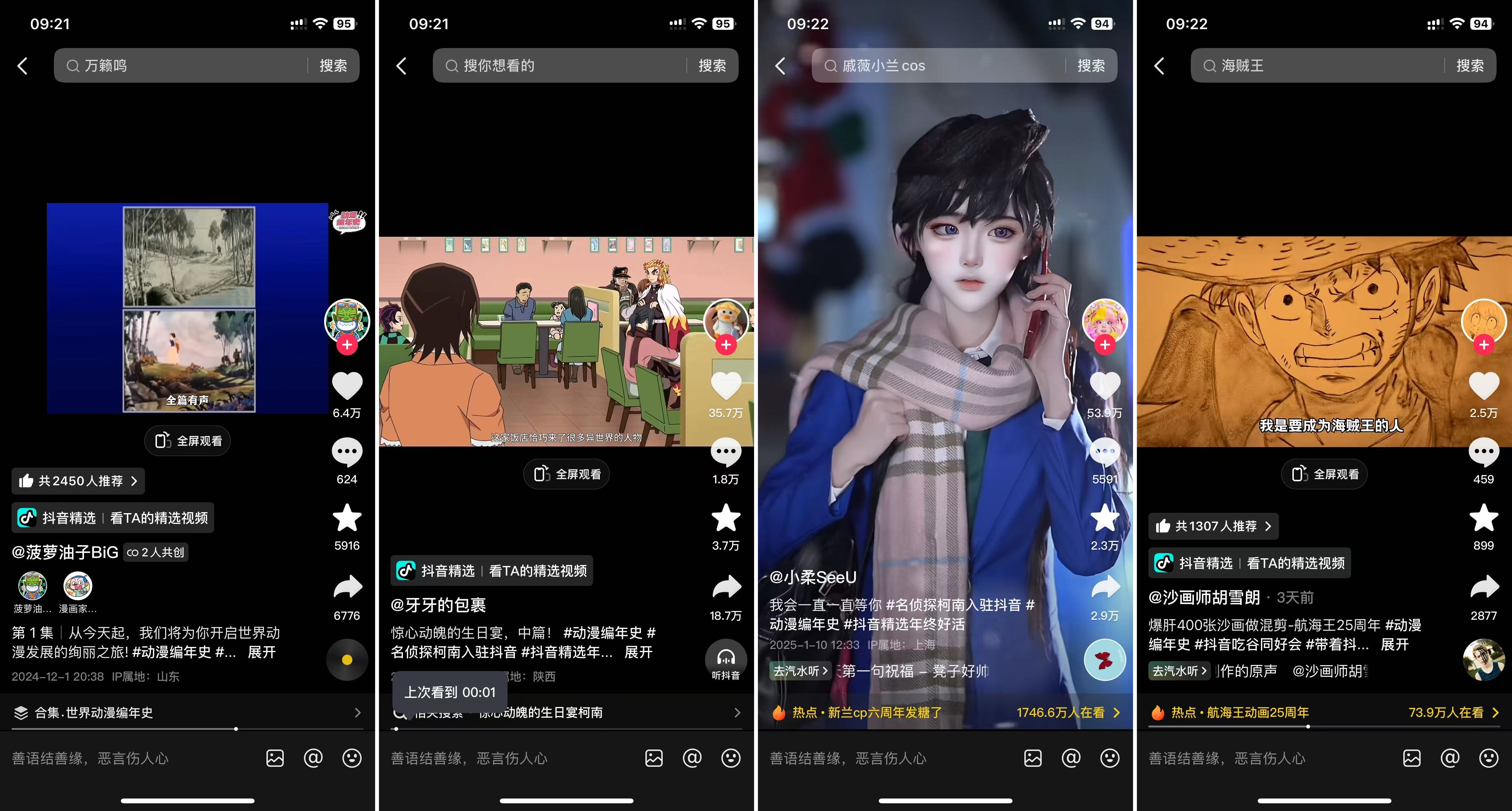 海量內(nèi)容沉淀 抖音二次元讓熱愛有處安放 “動漫編年史”特別企劃自去年11月上線以來,全網(wǎng)總曝光超27.5億,在榜播放量達(dá)54.3億,累計收獲熱搜31個,超1.2萬達(dá)人創(chuàng)作者參與互動,收獲超1.8萬個投稿作品。這其中不乏許多精品中長視頻,如雜談博主“菠蘿油子BiG”帶來的一系列動漫盤點視頻單期時長可達(dá)90多分鐘,同人動畫博主“牙牙的包裹”帶來的二創(chuàng)版《驚心動魄的生日宴》盡管時長不到五分鐘,卻融合名偵探柯南、航海王、火影忍者等諸多熱門IP,足見創(chuàng)作者付出的心血。