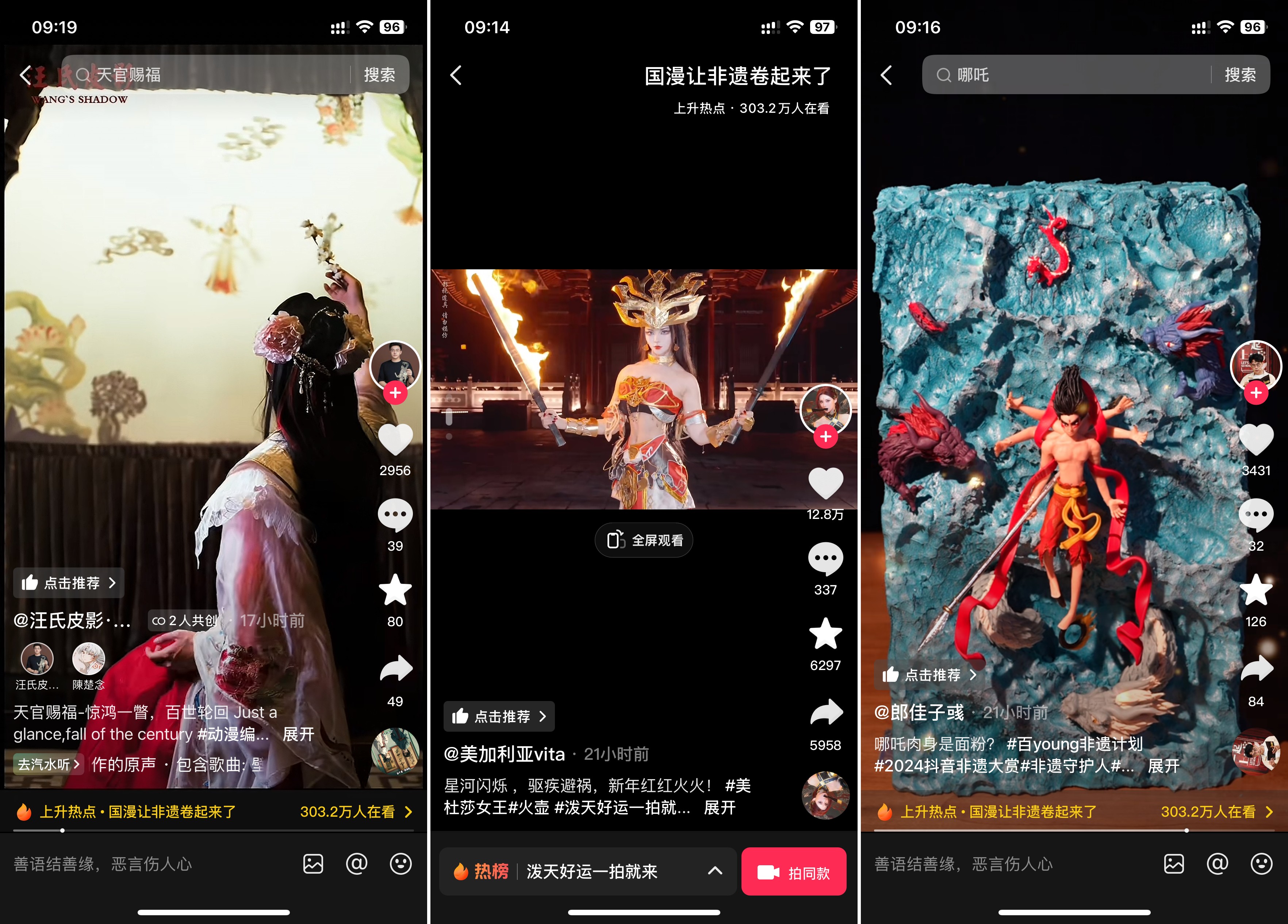 經(jīng)典海外動畫IP用情懷征服網(wǎng)友,國漫IP則攜手“非遺”技藝驚艷登場。皮影技藝夢幻聯(lián)動天官賜福、手影版葫蘆兄弟等作品,讓網(wǎng)友直呼:“終于知道為什么以前人愛看皮影戲了”?!抖菲粕n穹》里的美杜莎女王用一段應(yīng)景的火壺表演送上熱辣滾燙的新春祝福。正如面人郎手中的面團變身哪吒,在抖音,國漫讓非遺卷了起來,非遺則讓國漫綻放出別樣生命力。