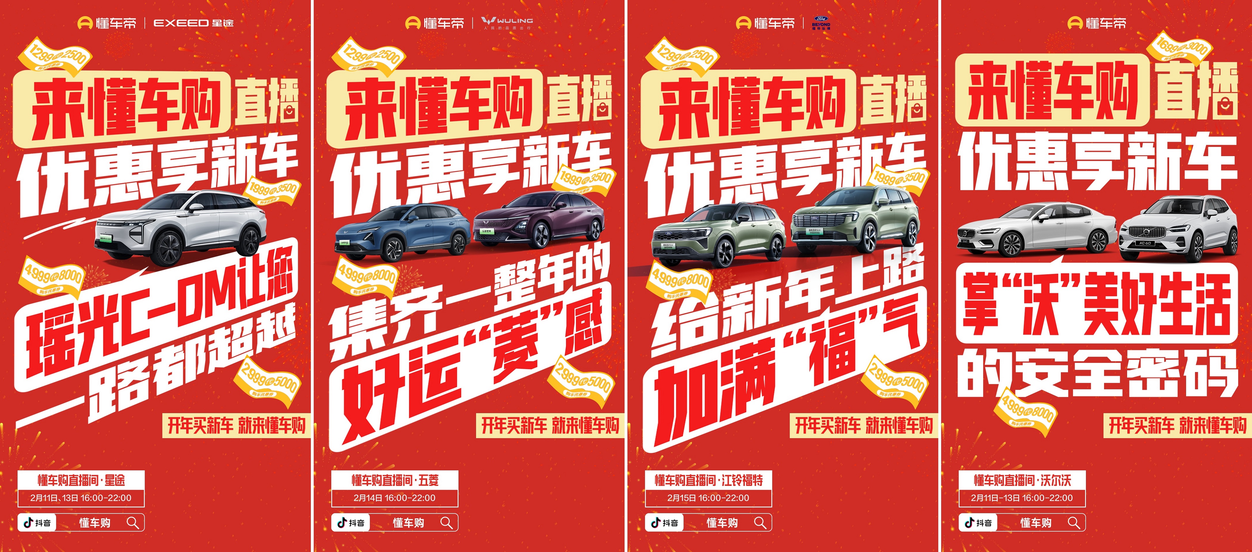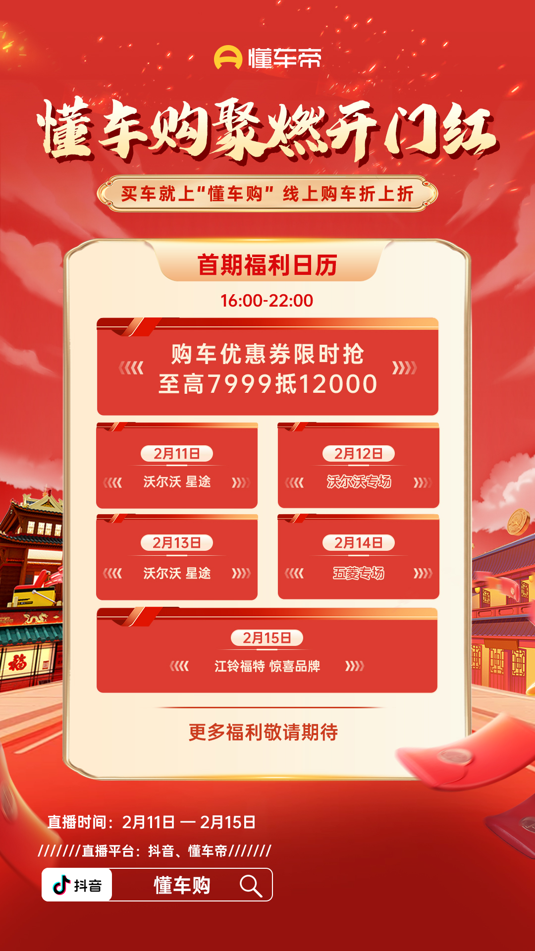 2月11日-15日,每天16:00-22:00,鎖定抖音賬號-懂車購聚燃開門紅直播間,一起把愛車開回家!