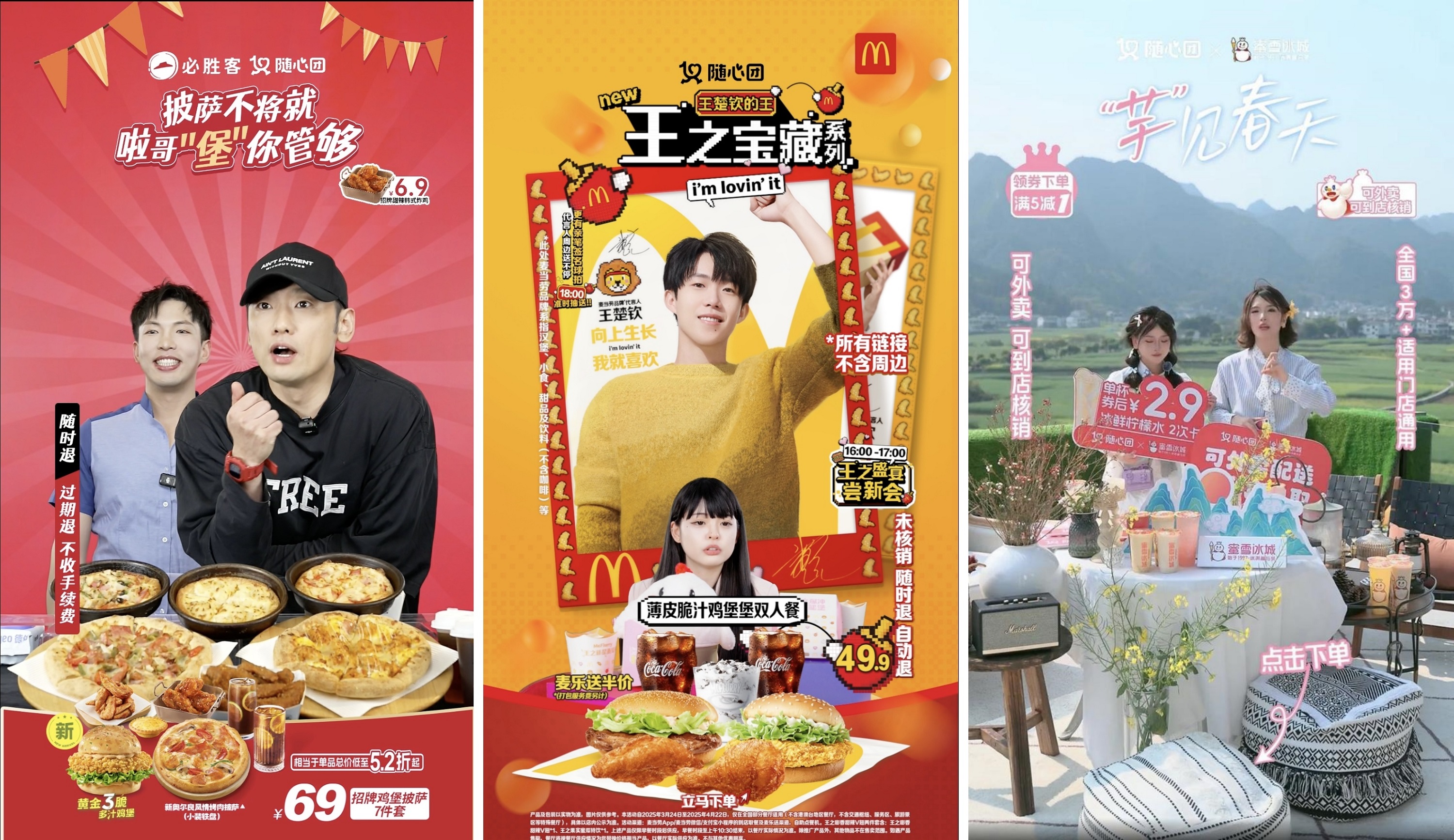 尋一份春趣,來(lái)一場(chǎng)全身心的放松。肯德基、必勝客等上新漢堡、比薩“隨心團(tuán)”,更有達(dá)美樂(lè)新品卷邊比薩,幫春日野餐露營(yíng)減輕負(fù)擔(dān),不僅可以到店用餐,還可選擇預(yù)約配送,不必提前幾天采購(gòu)備餐,一鍵下單,真正實(shí)現(xiàn)說(shuō)走就走的自由。麥當(dāng)勞不僅為春日聚會(huì)提供多款套餐,更聯(lián)動(dòng)代言人王楚欽掀起全民討論熱潮,妥妥占據(jù)社交話題“C位”。