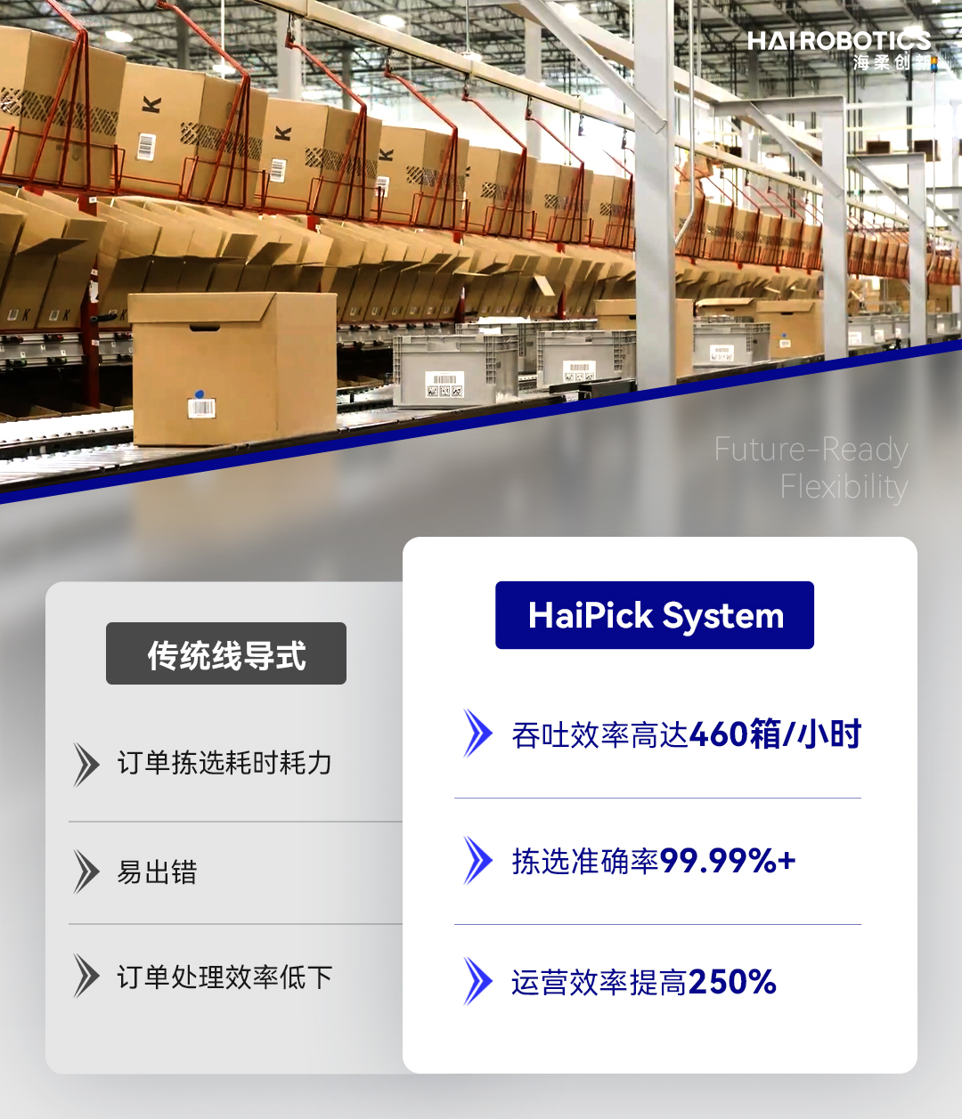 在HaiPick System 1的助力下,Boot Barn曾經(jīng)依賴的線導式訂單揀選方法已被高度集成化、智能化的作業(yè)模式取代,訂單僅經(jīng)一次人工揀選即可高效處理,且精準率高達99.99%。