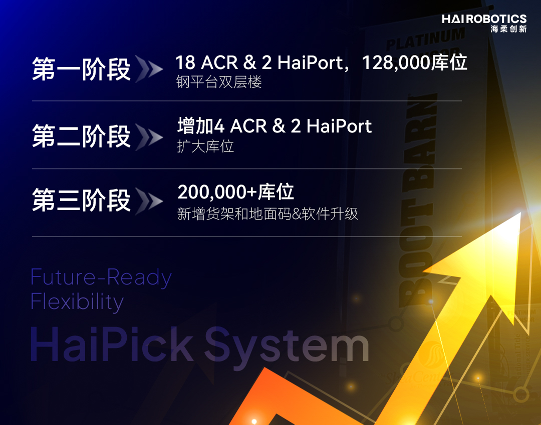 為應對Boot Barn高速增長的業(yè)務需求,海柔的解決方案展現(xiàn)出強大的適應能力。在短短兩年內,海柔成功協(xié)助Boot Barn進行了多次系統(tǒng)擴容,精準匹配其業(yè)務擴展訴求。這種靈活可擴展的解決方案特性,正是Boot Barn與海柔創(chuàng)新持續(xù)合作的重要原因之一。