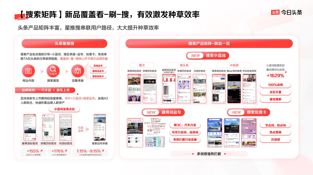 值得注意的是,今日頭條多元?jiǎng)?chuàng)新的產(chǎn)品矩陣也成為品牌營銷講故事、拓場景、訴情緒的價(jià)值護(hù)城河。從“黃金曝光點(diǎn)位”、“品牌互動(dòng)體驗(yàn)”到“產(chǎn)品價(jià)值引流”、“搜索高效種草”,既高效通連,又各有所長,通過在實(shí)踐中靈活組合,便能為品牌帶來高效率的閉環(huán)轉(zhuǎn)化。