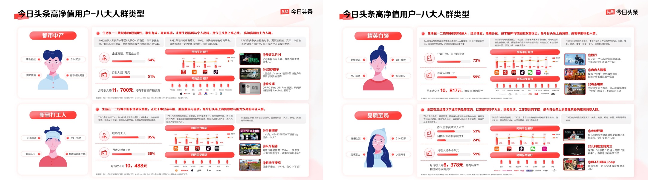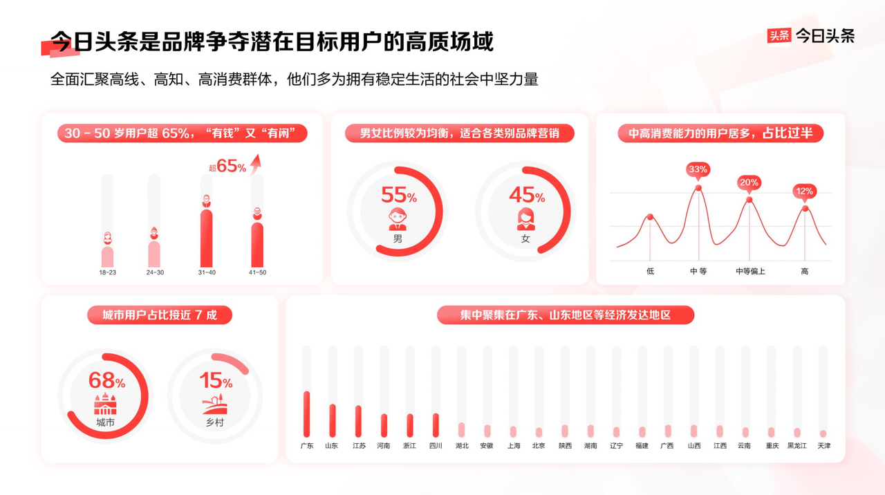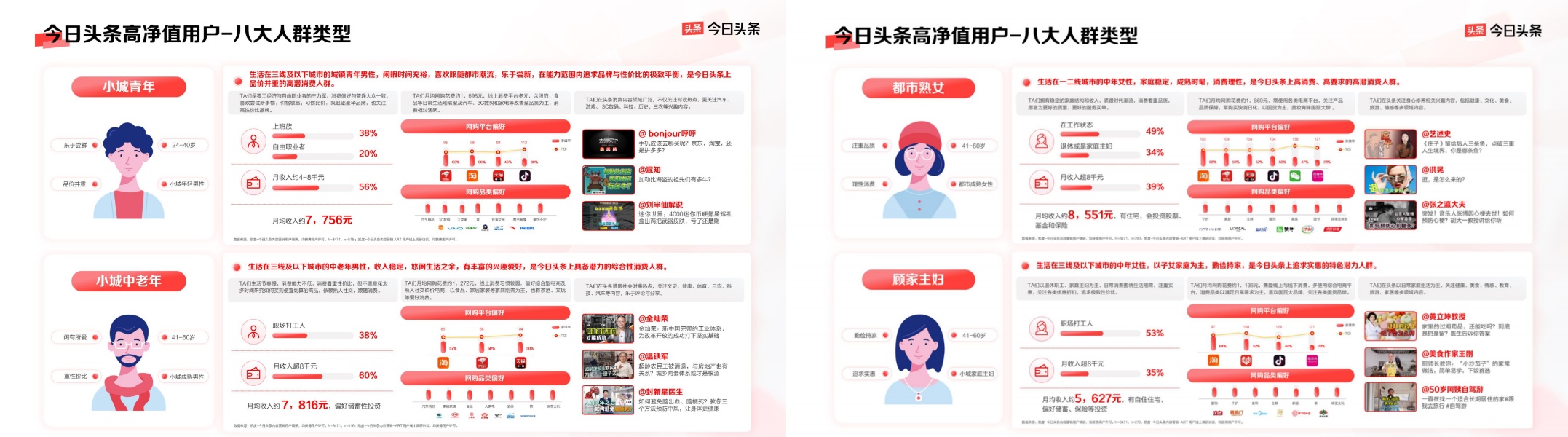 在億級(jí)體量優(yōu)勢基礎(chǔ)上,今日頭條用戶的高價(jià)值特點(diǎn)也十分明顯?;趶?qiáng)烈的資訊和熱點(diǎn)認(rèn)知,今日頭條聚集了以都市中產(chǎn)、新晉打工人、小城青年、小城中老年、精英白領(lǐng)、品質(zhì)寶媽、都市熟女、顧家主婦為主的八大高凈值用戶類型,覆蓋性別均衡、地域廣泛、興趣多元、消費(fèi)力強(qiáng)勁的多元用戶圈層。