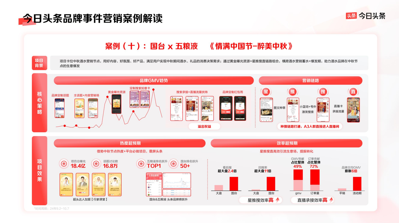 接下來,如何助力品牌節(jié)點(diǎn)生意爆發(fā)?今日頭條選擇以“黃金曝光資源+星推搜直鏈路”組合,高效引流品牌生意場,打造“種-搜-拔”的轉(zhuǎn)化閉環(huán),有效縮短決策鏈路,讓用戶消費(fèi)路徑更絲滑順暢,品牌日均GMV膨脹6倍,GMV貢獻(xiàn)占比整體49%。