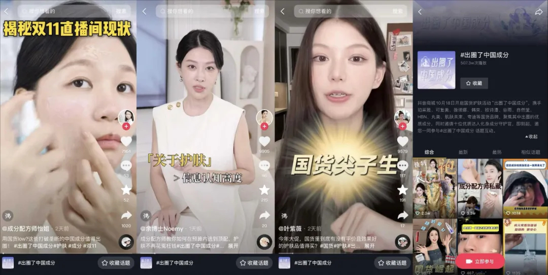 雙11期間,抖音電商利用了全域興趣電商的生態(tài)優(yōu)勢,幫助國貨護膚品牌打造產(chǎn)地溯源、達人種草等多元化優(yōu)質(zhì)內(nèi)容,致力在雙11期間實現(xiàn)「中國成分」的概念擴傳,充當(dāng)著類似“放大鏡”“加速器”的關(guān)鍵角色。