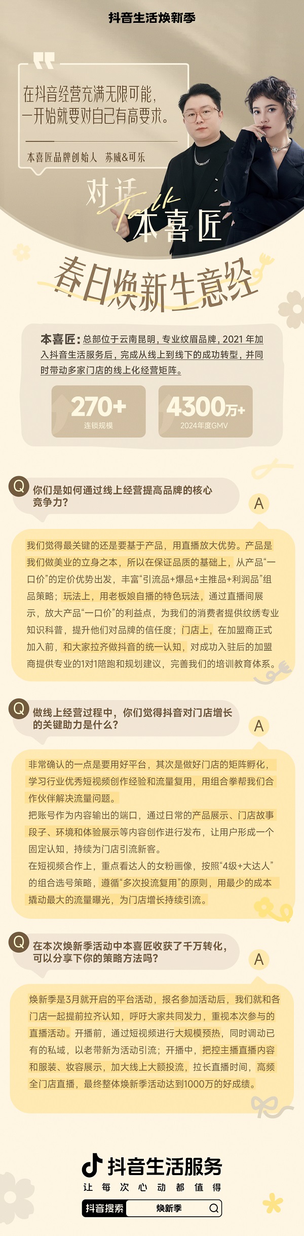 從用戶的問題里看到痛點和機會,把傳統(tǒng)紋眉的“店等人”轉(zhuǎn)向“人找店”,在有品類無品牌的紋繡行業(yè)做出全國連鎖......本喜匠一次次用“反常識”在抖音踏出了增長之路,「抖音生活煥新季」期間,單月支付突破了1000萬元。