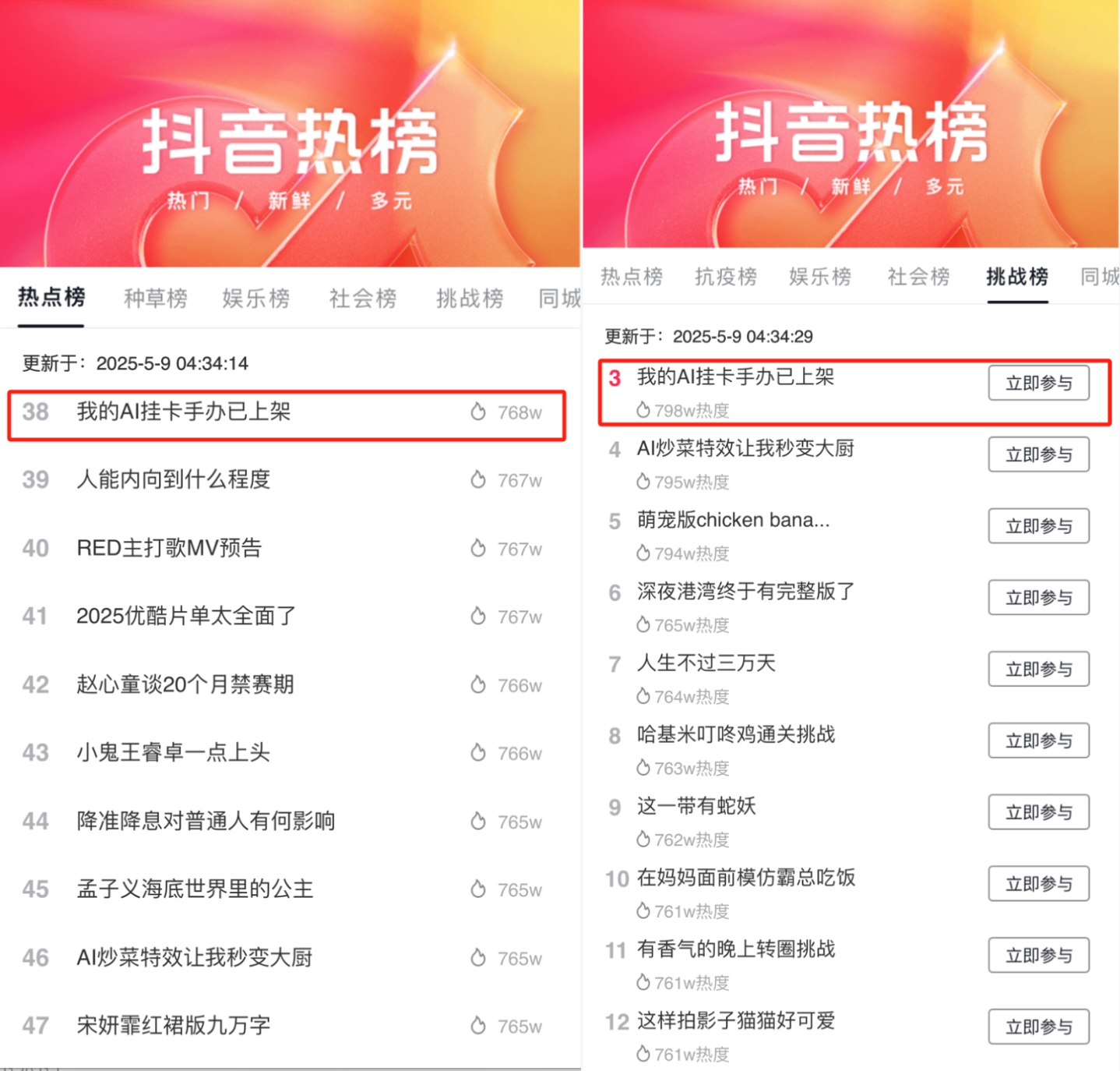 截至5月15日14點(diǎn),#我的AI掛卡手辦已上架 話題投稿量近萬(wàn) ,最高登陸站內(nèi)總榜TOP38、挑戰(zhàn)榜TOP3。