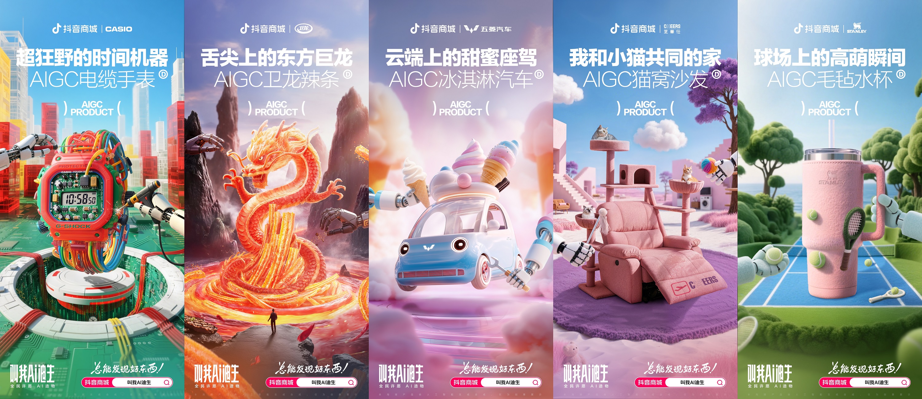 全民許愿,商家接棒。抖音商城還聯(lián)合了海爾、阿迪達(dá)斯、周生生等10家品牌,發(fā)布了聯(lián)名創(chuàng)意海報(bào)。機(jī)械金蟬賽博朋克招財(cái)、透明洗衣機(jī)直驅(qū)宇宙潔凈之旅、液態(tài)金屬外套成了柔軟又堅(jiān)硬的戰(zhàn)袍…… 網(wǎng)友與品牌的腦洞創(chuàng)想,在「叫我AI迪生」中擁有了實(shí)現(xiàn)的可能。