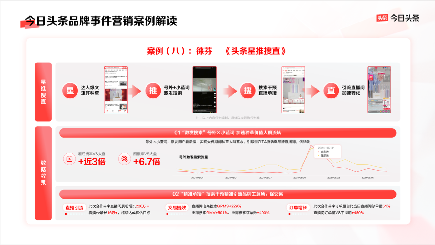 個護小家電品牌徠芬,在今日頭條巧用「頭條星推搜直」,打通達人爆文矩陣種草、號外+小藍詞激發(fā)搜索、搜索干預(yù)直播承接、引流直播間加速轉(zhuǎn)化全鏈路,在產(chǎn)品從種草到交易全過程中,構(gòu)建出品牌專屬注意力真空場域。 在大促期間,各平臺流量既繁雜又昂貴。而徠芬在今日頭條的商業(yè)化產(chǎn)品矩陣布局,以更效果導(dǎo)向,精準構(gòu)建品牌生意場,從而實現(xiàn)直播間電商搜索GPMS增長229%,電商搜索GMV增加501%、電商搜索訂單數(shù)增長400%。在大促期間,實現(xiàn)品牌高效種草轉(zhuǎn)化。