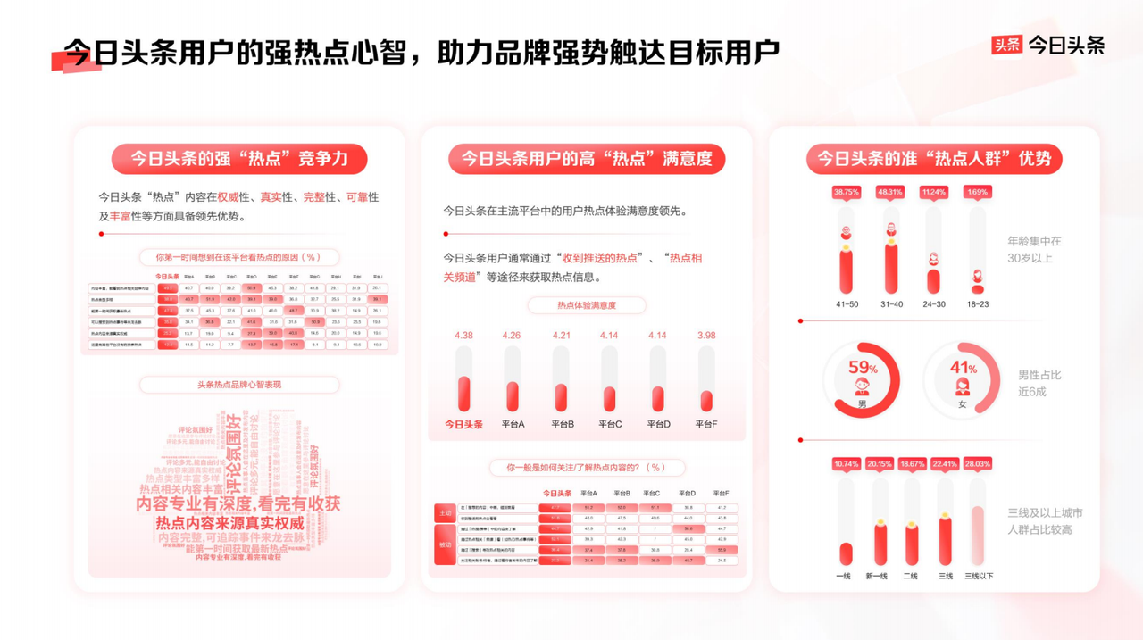 今天的商業(yè)世界里,新鮮事已經(jīng)不多了。 幾大互聯(lián)網(wǎng)巨頭格局落定,消費路徑、營銷玩法日益成熟,處處是紅海。但新的品牌產(chǎn)品還在源源不斷地出來,去哪里要增長? 12月初的2024今日頭條商業(yè)大會上,我們看到另一種可能。在以短視頻APP為代表的綜合類內(nèi)容平臺,以小說、短劇等為主要消費對象的娛樂類內(nèi)容平臺,都幾乎被挖掘殆盡、越來越卷之后——以今日頭條為代表的資訊類內(nèi)容平臺,成為品牌營銷最后一片尚未深紅的海域。 在近日發(fā)布的《2024今日頭條平臺營銷通案》中,種種整合營銷方法的歸納和既往案例展示,進一步印證了我們的判斷。可以說,布局今日頭條、搶占熱點內(nèi)容賽道的營銷先機,讓更多品牌找到了反卷生長的可能。