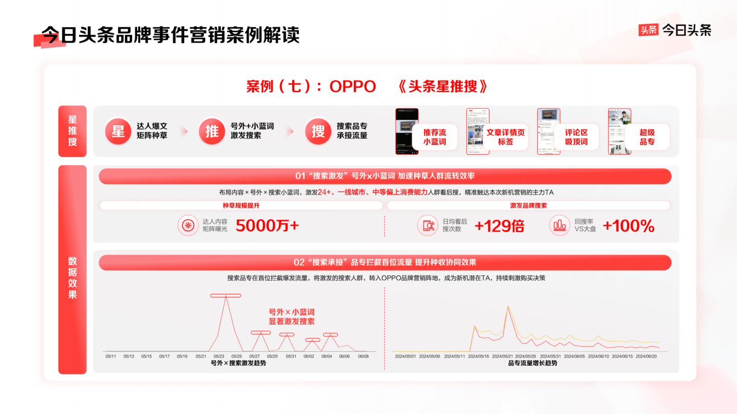 如OPPO新機上線。今日頭條配合品牌布局頭條星推搜,針對性觸達24+、一線城市、中等偏上消費能力人群,激發(fā)其看后搜動作。通過達人爆文矩陣種草、號外+小藍詞激發(fā)搜索、搜索品專承接流量,層層遞進,協(xié)助OPPO新機獲得5000萬+曝光,激發(fā)日均看后搜次數(shù)增長129倍、回搜率對比大盤增加100%。今日頭條幫助品牌在新品上市期精準觸達高潛用戶人群,搶占先機。