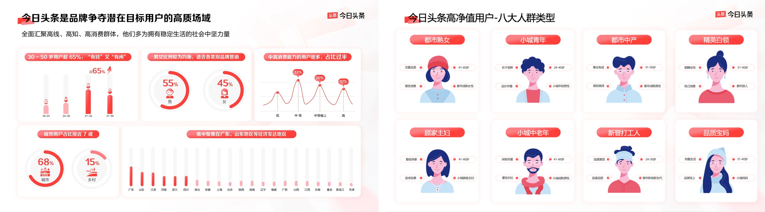 高凈值人群聚集只是一個基礎(chǔ),對品牌營銷而言,更重要的是如何將平臺人群為我所用,將平臺高凈值人群轉(zhuǎn)化為品牌消費者。 從《通案》中可以看到,今日頭條的高凈值人群活躍度更高、觸點更豐富,且平臺針對都市中產(chǎn)、新晉打工人、小城青年、小城中老年、精英白領(lǐng)、品質(zhì)寶媽、都市熟女、顧家主婦八大人群類型,及其消費特征、內(nèi)容關(guān)注,都有系統(tǒng)歸納,方便品牌精準觸達。