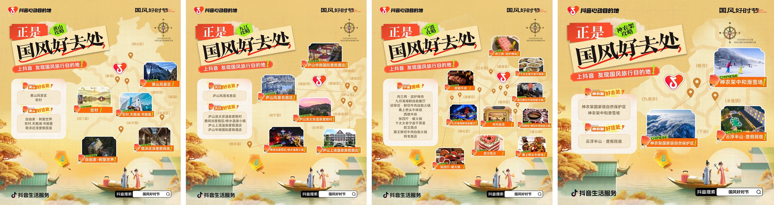 這個秋冬,抖音生活服務(wù)異地場景營銷IP「心動目的地」打造國風(fēng)系列第二期——「心動目的地·國風(fēng)好時節(jié)」,實(shí)現(xiàn)三重“心動升級”:行程更心動,橫跨11至12月,將先后抵達(dá)黃山、九江、寧波、神農(nóng)架林區(qū)、嘉興、西安、洛陽七個心動目的地,從層林浸染到大雪紛飛,在秋冬風(fēng)光淋漓盡現(xiàn)的地方,見證每一場浪漫;貨品更心動,精選地標(biāo)景區(qū)和六萬余款酒旅、餐飲商品,低至五折起,更有滿50-10元超值代金券每天限量開搶;玩法更心動,海陸、陳鶴一、司瑤等多位明星超頭出任「心動目的地推薦官」,與你同游國風(fēng)好去處。不僅將在洛陽等地舉行「國風(fēng)市集」等趣味線下大事件,還將在抖音發(fā)起#國風(fēng)好時節(jié) 線上話題互動,為創(chuàng)作者們送出豐厚流量獎勵!