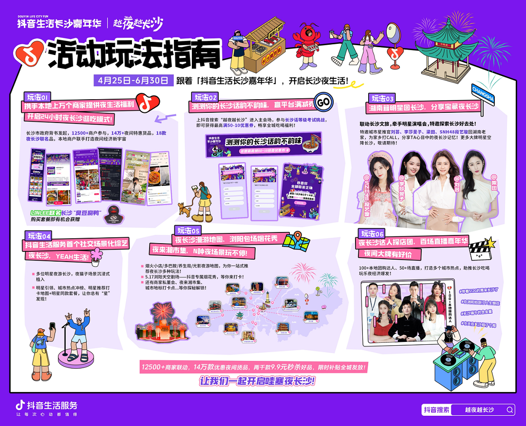 4月25日至6月30日,「抖音生活長沙嘉年華-越夜越長沙」IP活動正在點燃長沙夜晚!這個春夏,抖音生活服務(wù)圍繞長沙獨有的文化特色,整合明星陣容、聯(lián)動政府文旅資源,在湘江兩岸鋪開一幅“食、游、購、娛”全景夜生活圖鑒,同步聯(lián)動多領(lǐng)域商家探索消費新場景,實現(xiàn)交易增長。
