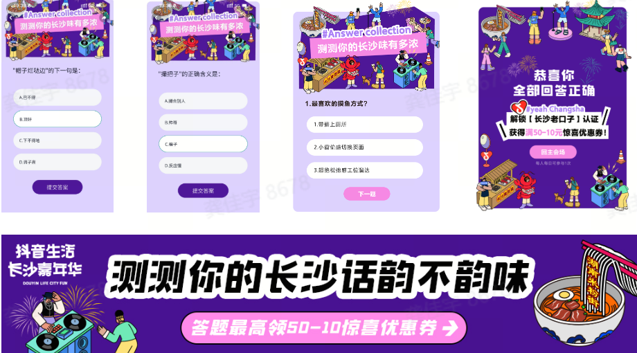 活動還為參與用戶提供了滿滿福利!參與漫游地圖活動并到店互動,可以獲得夜長沙周邊禮品,上抖音搜索“越夜越長沙”,進入會場參與《長沙話等級考試》互動答題還能贏滿減消費券。