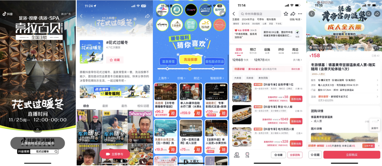 這不,冬天拍了拍我,帶來了由抖音生活服務(wù)聯(lián)合超頭明星達(dá)人和品牌頭客商家共同發(fā)起的冰雪溫泉季之「冰雪暖冬季」IP活動(dòng),一場(chǎng)專為消費(fèi)者打造的暖冬節(jié)氛圍,特別精選室內(nèi)外滑雪、溫泉體驗(yàn)、洗浴按摩,搭配精致的面包甜點(diǎn)和暖心飲品,串聯(lián)起一個(gè)完美的冬日?qǐng)鼍?,通過一系列精心策劃的活動(dòng),刺激消費(fèi)者的購買心智,激發(fā)消費(fèi)熱情,從而實(shí)現(xiàn)GMV的爆發(fā)式增長(zhǎng)。