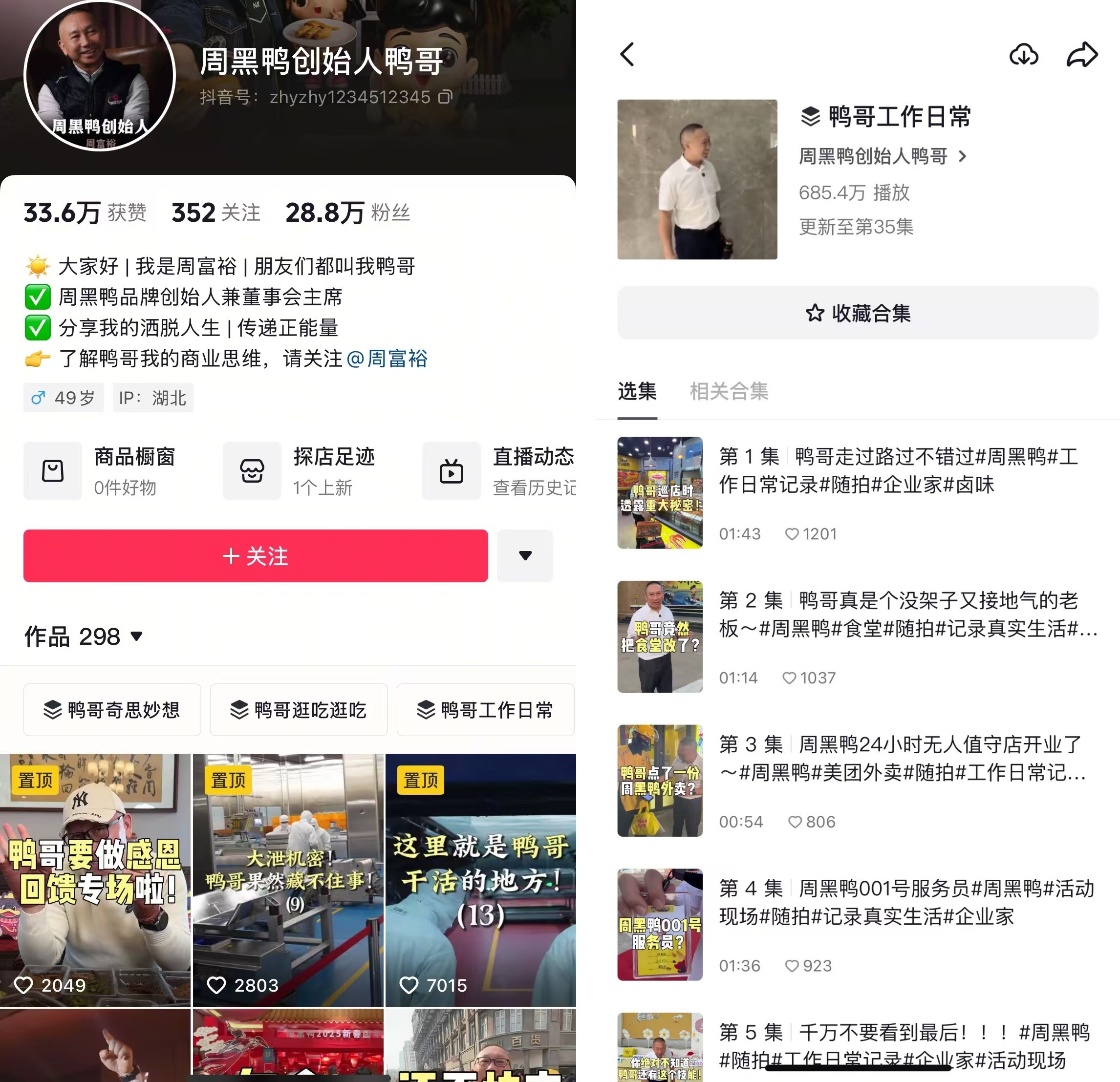 進(jìn)入2024年,在直播之余,鴨哥開始把更多的精力投入到短視頻經(jīng)營。從新產(chǎn)品的研發(fā),講到探訪周黑鴨工廠,從早期的創(chuàng)業(yè)經(jīng)歷,聊到日常的工作生活,他的短視頻類型豐富,內(nèi)容覆蓋到了品牌的各個(gè)角落。透過抖音,周黑鴨產(chǎn)品“精雕細(xì)琢”的生產(chǎn)過程,以及鴨哥“真誠接地氣”的形象都被記錄了下來。他的抖音粉絲數(shù),目前超過了28萬。