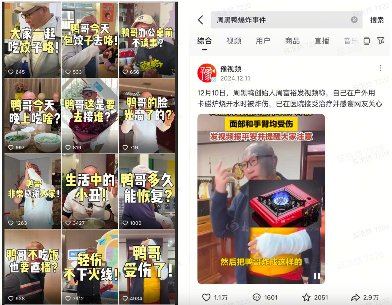 12月7日,鴨哥因?yàn)楸豢ㄊ綘t炸傷而暫停了2天的直播,引發(fā)了全網(wǎng)粉絲的關(guān)心。12月9日,“周黑鴨創(chuàng)始人被卡磁爐炸傷”的話題,沖上熱搜榜。“潑天流量”來得很突然,很多網(wǎng)友都在關(guān)心“鴨哥究竟怎么樣了”,讓鴨哥覺得,有必要通過短視頻做出回應(yīng)。他在抖音第一時(shí)間連續(xù)發(fā)布多條本人視頻,分享了受傷后的恢復(fù)情況,也展現(xiàn)出“輕傷不下火線”的工作狀態(tài)。“老板躬身入局很值得,只為了讓消費(fèi)者看見品牌的堅(jiān)持、更加信任周黑鴨。”