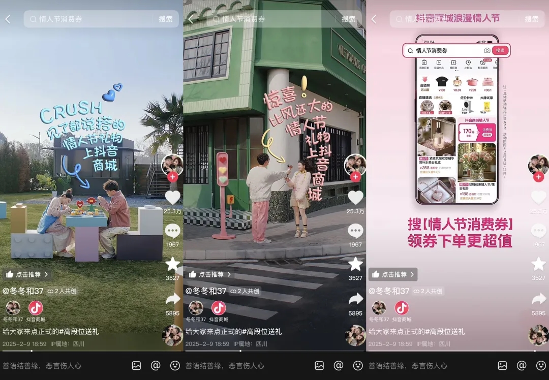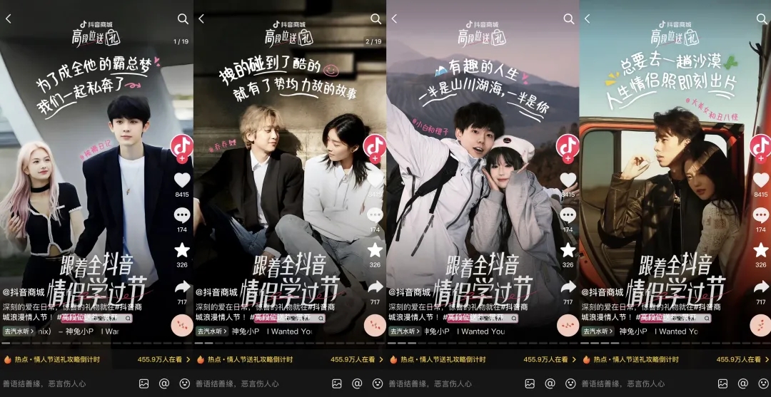 首先一大亮點,是抖音電商巧妙利用情人節(jié)的獨(dú)特情感氛圍,邀請情侶達(dá)人參與到活動中,創(chuàng)作優(yōu)質(zhì)內(nèi)容,借助情侶之間真摯的情感表達(dá),引起目標(biāo)受眾的情感共鳴,增強(qiáng)用戶對情人節(jié)送禮文化的認(rèn)同。