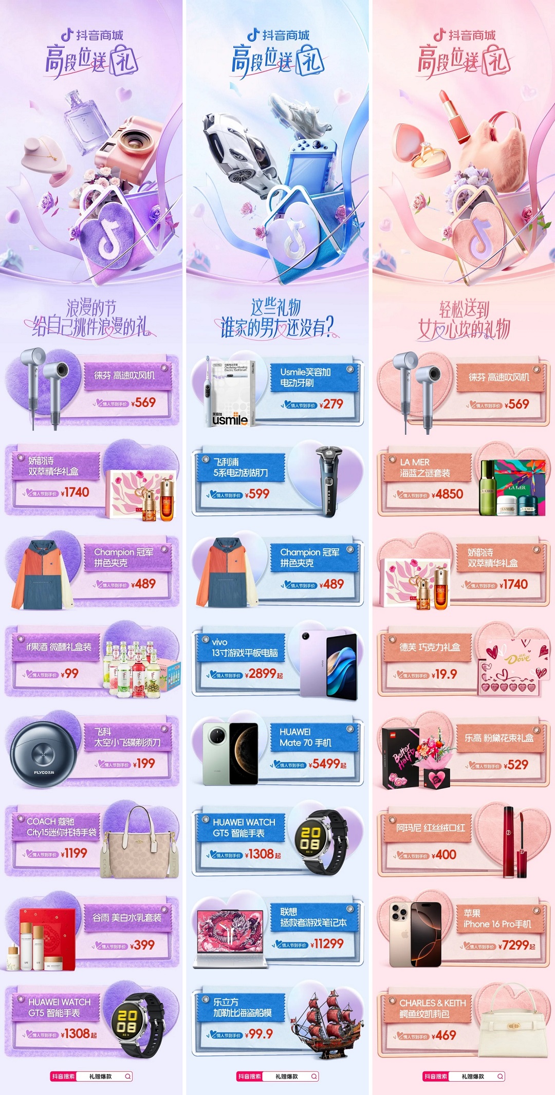 “給自己挑件浪漫的禮” 清單,契合當(dāng)下追求自我關(guān)懷的消費(fèi)心理,讓消費(fèi)者在情人節(jié)這個特殊日子里,為自己的生活增添一份儀式感。而送男友、送女友的禮物清單,則分別精準(zhǔn)考量了男性的興趣愛好與實用需求,以及女性注重情感細(xì)節(jié)、追求浪漫精致的特點。