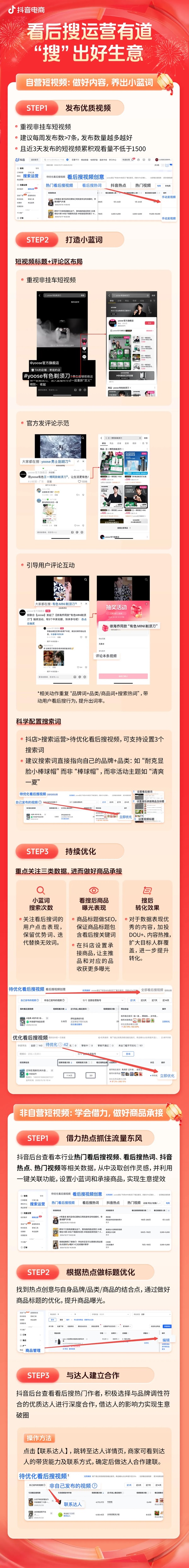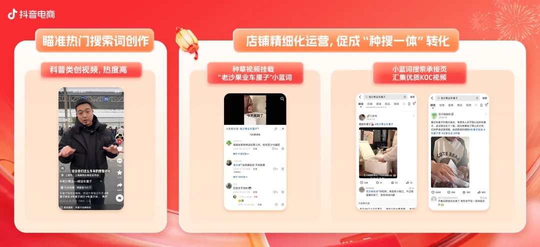 抖音商城年貨節(jié)期間,抖店「搜索運(yùn)營(yíng)」專區(qū)還進(jìn)行全面升級(jí),為商家提供從視頻靈感創(chuàng)意到視頻運(yùn)維的一站式解決方案,助力更多商家“搜”出好生意。