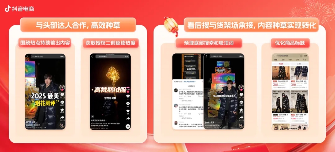 同時(shí),高梵官方旗艦店在達(dá)人評(píng)論區(qū)互動(dòng)認(rèn)領(lǐng),獲取達(dá)人授權(quán)二創(chuàng)視頻延續(xù)熱度,吸引中小達(dá)人創(chuàng)作,熱度不斷攀升。在此基礎(chǔ)上,高梵預(yù)埋底部搜索和吸頂詞#高梵黑金羽絨服,“高梵白冰同款”,并結(jié)合小藍(lán)詞優(yōu)化商品標(biāo)題SEO,加速了生意的轉(zhuǎn)化。自1月以來,日均搜索商品卡GMV對(duì)比雙11爆發(fā)提升43%。