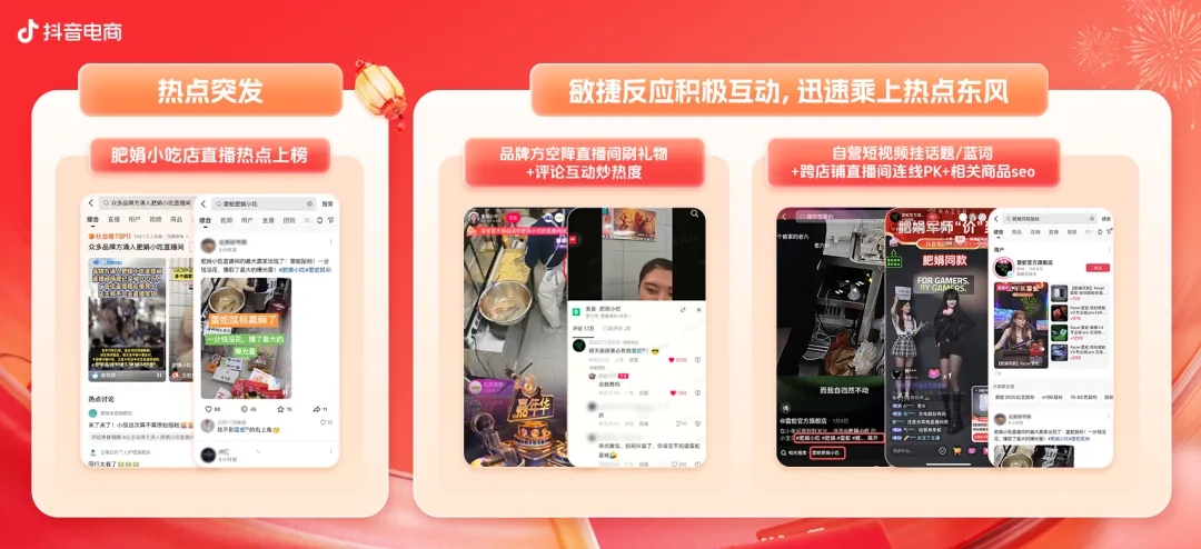例如,雷蛇借力肥娟小吃店直播的熱度,空降直播間贈(zèng)送禮物,在評(píng)論區(qū)留下“明天巔峰必有我雷神”等趣味互動(dòng),提升產(chǎn)品聲量,并在自營(yíng)短視頻中掛載“肥娟同款鼠標(biāo)”小藍(lán)詞,帶動(dòng)搜索的全面爆發(fā)。借此,雷神實(shí)現(xiàn)品牌相關(guān)搜索pv環(huán)比提升262%、搜索GMV環(huán)比提升47%,帶動(dòng)銷量和聲量的雙重提升。