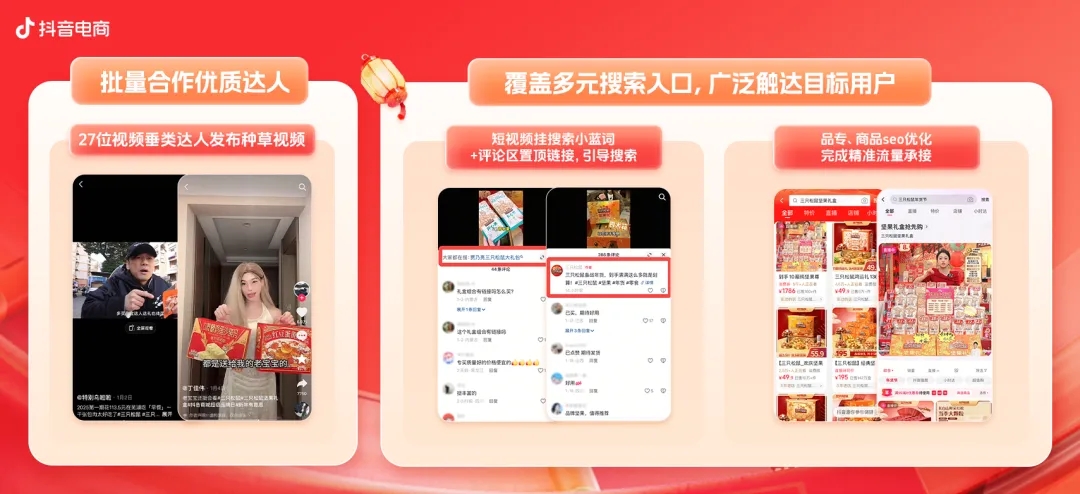 三只松鼠則合作近30位食品垂類優(yōu)質(zhì)達(dá)人,集中發(fā)布年貨種草短視頻,有效提升產(chǎn)品的市場(chǎng)熱度與消費(fèi)者的購(gòu)買興趣,并通過短視頻掛搜索小藍(lán)詞“三只松鼠堅(jiān)果禮盒”,評(píng)論區(qū)置頂鏈接等多種形式引導(dǎo)用戶搜索、購(gòu)買產(chǎn)品。同時(shí),搜索結(jié)果頁(yè)通過品專、商品SEO優(yōu)化等動(dòng)作完成精準(zhǔn)流量承接,搜索量環(huán)比提升264%、搜索GMV環(huán)比增加132%。