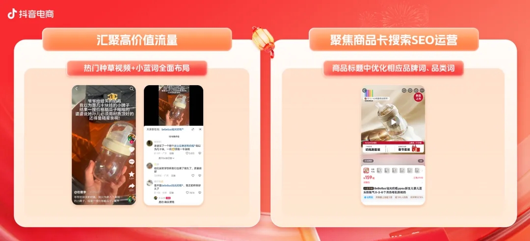 匯聚高價(jià)值流量、養(yǎng)出小藍(lán)詞后,商品的高效承接同樣十分關(guān)鍵。年貨節(jié)期間,bebebus鉆光奶瓶通過「熱門種草視頻+小藍(lán)詞布局」觸達(dá)潛力目標(biāo)客群后,聚焦商品卡搜索SEO運(yùn)營(yíng),在商品標(biāo)題中優(yōu)化相應(yīng)品牌詞、品類詞,讓商品卡自然流與商業(yè)流雙雙提效,達(dá)成鉆光奶瓶商品搜索成交人數(shù)上升150%,品牌整體商品曝光人數(shù)環(huán)比上漲60%。