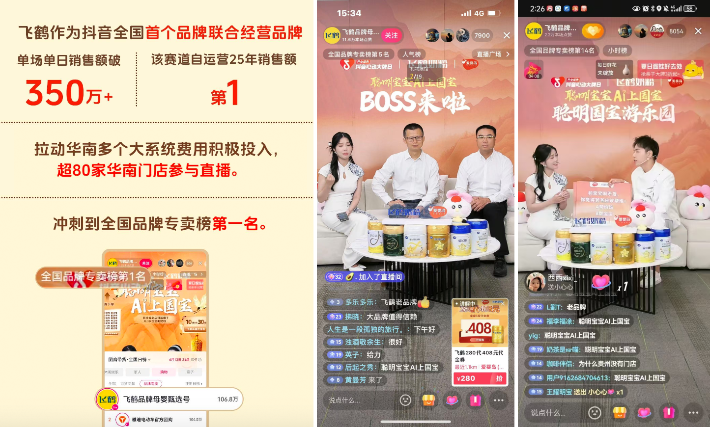 而在活動(dòng)關(guān)鍵節(jié)點(diǎn),一場(chǎng)別開生面的文化直播將熱度推向了高潮。 6月11日,品牌在飛鶴品牌母嬰臻選號(hào)打造“BOSS古風(fēng)專場(chǎng)”,愛嬰島副總裁葉發(fā)朝與中國(guó)飛鶴營(yíng)銷副總經(jīng)理陳曉東親臨現(xiàn)場(chǎng),聯(lián)動(dòng)頭部生服主播馬樹開展沉浸場(chǎng)景互動(dòng),以“ 600抵700元代金券”點(diǎn)燃用戶搶購(gòu)熱情,更以小米按摩器、華為手機(jī)等實(shí)用禮品深化互動(dòng)溫度。這場(chǎng)三小時(shí)直播創(chuàng)下超8300人同時(shí)在線的峰值記錄。飛鶴不僅成為了品牌聯(lián)合經(jīng)營(yíng)首個(gè)抖音生活服務(wù)單日銷售額突破300萬的品牌,更通過“高管帶貨+國(guó)風(fēng)美學(xué)+鉅惠福利”的創(chuàng)新組合,將直播間熱度高效轉(zhuǎn)化為線下門店的核銷動(dòng)力,讓傳統(tǒng)促銷升維為有溫度、有質(zhì)感的品牌對(duì)話。