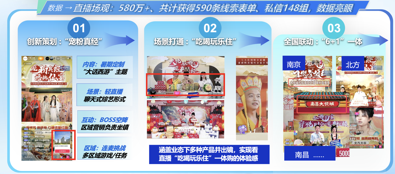 與前兩者不同,中糧大悅城作為商業(yè)地產(chǎn)品牌,以大話西游為主題,結(jié)合聊天式綜藝的形式,在巨量平臺的支持下制定“創(chuàng)新策劃-場景打通-全國聯(lián)動”三步走策略,分別對應(yīng)“寵粉真經(jīng)”、“吃喝玩樂住”、“6+1”一體三部分,在直播前、中、后都進(jìn)行了全盤鋪排,保證直播閉環(huán),實現(xiàn)品牌宣傳和線索收集、產(chǎn)品推介等多重營銷目標(biāo)。
