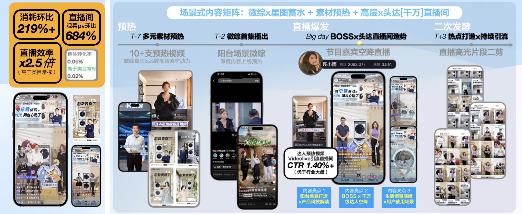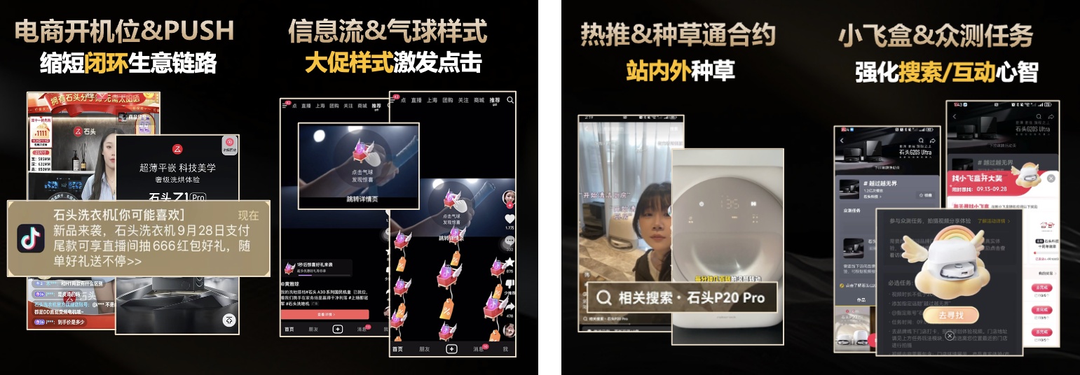 在預(yù)熱階段,品牌通過十幾支預(yù)熱視頻和品牌創(chuàng)新微綜形式,為后續(xù)活動營造氛圍,擴(kuò)大品牌影響力。而在最為關(guān)鍵的直播階段,品牌老板和頭部達(dá)人共同參與到直播中來,打造產(chǎn)品科技解讀、用戶使用場景展示、生活情景演繹等豐富內(nèi)容點,吸引用戶停留和轉(zhuǎn)化。此后,利用直播素材,品牌對直播高光片段進(jìn)行二次創(chuàng)作剪輯,持續(xù)吸引品牌流量。
