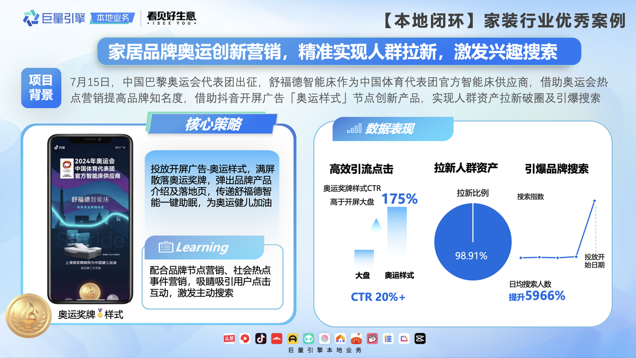 舒福德是抖音開屏廣告「奧運(yùn)樣式」家居行業(yè)首單案例,數(shù)據(jù)顯示奧運(yùn)獎牌樣式CTR高于開屏大盤175%,人群拉新比例高達(dá)98.91%,日均搜索人數(shù)提升5966%,投放當(dāng)天搜索指數(shù)達(dá)到頂峰。