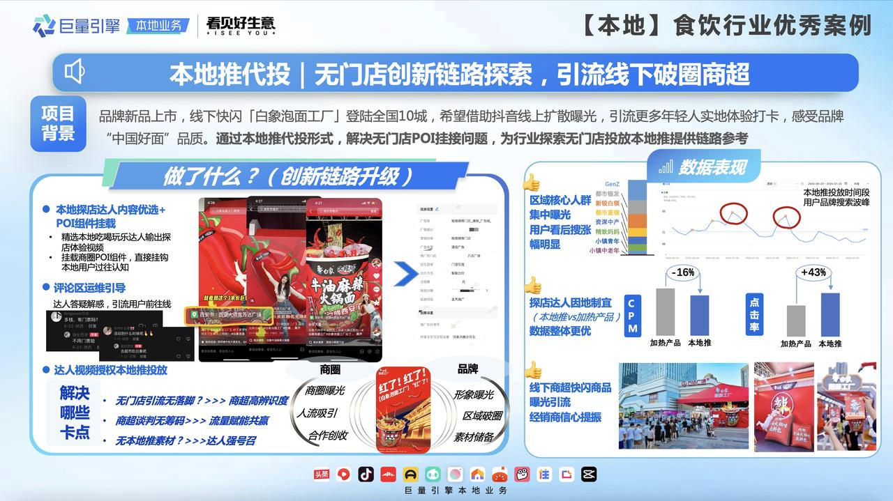 通過這次營銷,白象中國也成為行業(yè)首個本地推一代多代投案例,利用商超超高辨識度、流量賦能共贏和達(dá)人強(qiáng)號召力,解決了無門店引流無落腳、商超談判無籌碼、無本地推素材等卡點,特別是解決了無門店P(guān)OI掛接問題,為行業(yè)探索無門店投放本地推提供了鏈路參考。