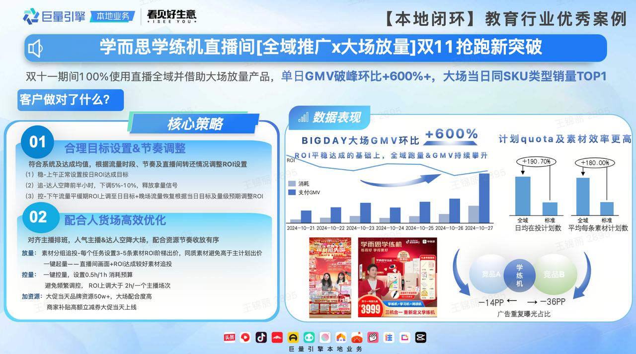 學(xué)而思在雙十一期間100%使用直播全域推廣,通過“合理目標(biāo)設(shè)置&節(jié)奏調(diào)整,配合人貨場高效優(yōu)化”的核心策略,設(shè)置合理目標(biāo),及時調(diào)整ROI設(shè)置,人貨場高效優(yōu)化,資源節(jié)奏收放有序,最終完成BIGDAY大場GMV 破峰環(huán)比增長超600%的驚人突破,在當(dāng)日同 SKU 類型銷量中拿下TOP1。
