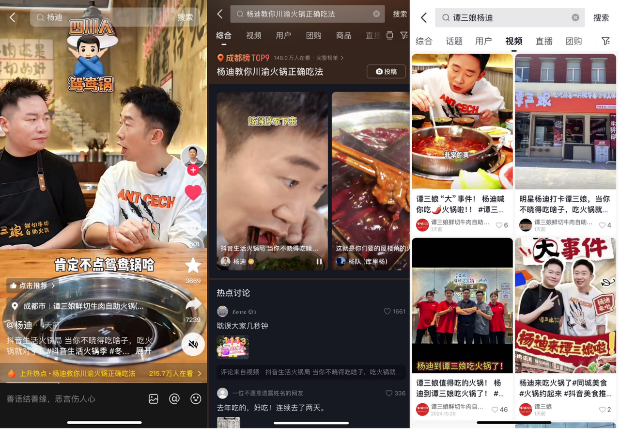 譚三娘鮮切牛肉自助火鍋在此基礎上來了一手“強強聯(lián)合”,創(chuàng)新了老板×明星合拍的玩法。身為四川人兼美食愛好者的@楊迪 對火鍋的點評可信度自然很高。和他一起來到門店,翻滾的紅油鍋底、新鮮的手切牛肉、蘸鞋底都好吃的蘸料讓人不禁從嘴角留下羨慕的眼淚。老板雖出鏡不多,但他一口正宗川普的熱情介紹、“吃垮抖音”的幽默發(fā)言,都讓用戶感受到這家店的熱情與實在。隨著視頻點贊量飆升突破16萬,門店曝光也暴漲117萬。得益于在抖音生活服務的經(jīng)營基礎,譚三娘鮮切牛肉自助火鍋以門店矩陣視頻完成@楊迪打卡門店的信息擴散,發(fā)布5天后帶來搜索GMV共330萬,當月累計支付GMV也水漲船高,已突破2400萬。