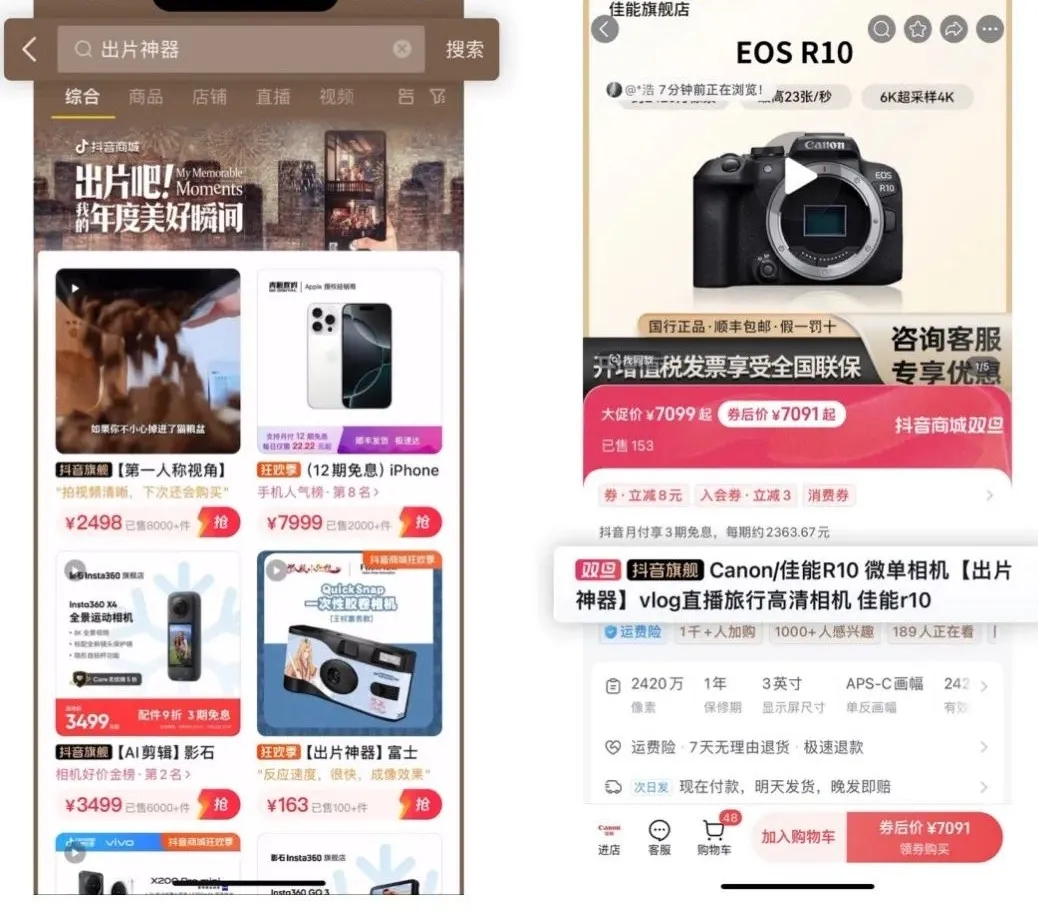 在這個過程中,搜索發(fā)揮著關(guān)鍵作用。比如,隨著年末到來,抖音用戶紛紛打開相冊回顧這一年的精彩瞬間,在“出片吧!我的年度美好瞬間”等話題下分享照片,營造滿滿的儀式感。佳能捕捉到這一趨勢,通過內(nèi)容的批量種草,引導(dǎo)用戶搜索“出片神器”,將其孵化成熱門搜索小藍(lán)詞。此外,品牌還積極進(jìn)行商品的標(biāo)題優(yōu)化,提升占詞效率,提升流量承接,帶動了單品和全店業(yè)績的爆發(fā)。