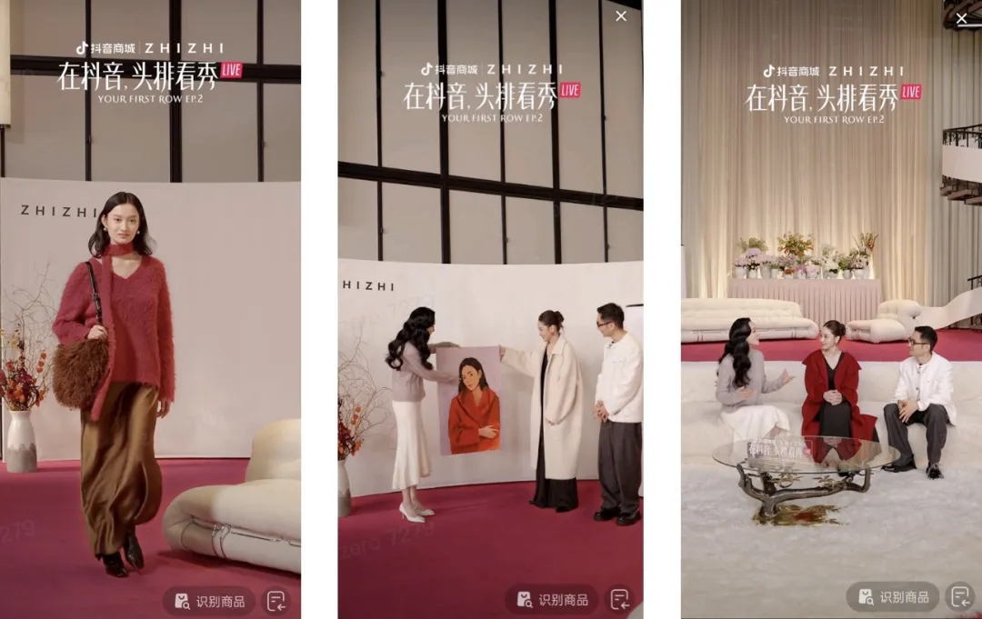 比如在時尚領(lǐng)域,“ZHIZHI 致知”把時裝秀玩出了“新花樣”,直接將傳統(tǒng)秀場搬到了抖音直播間。品牌像辦“閨蜜聚會”一樣,布置了生活氣息濃厚的秀場,瞬間拉近了T臺與觀眾之間的距離,讓人倍感溫馨和親切。
