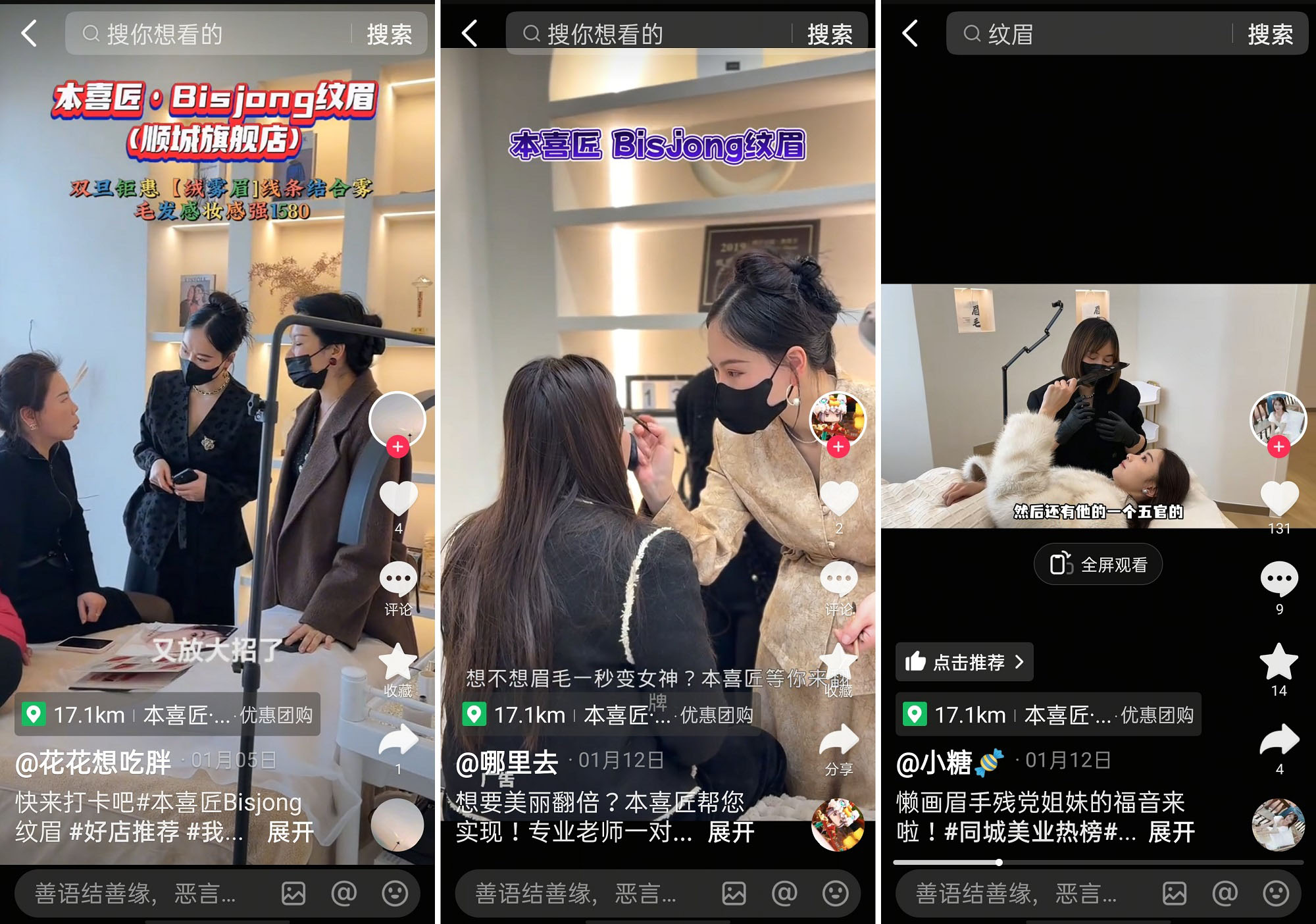 本喜匠把短視頻作為免費的形象窗口,借鑒行業(yè)成功經(jīng)驗,用好“他山之石”直接“套公式”,全景式展現(xiàn)門店環(huán)境、產(chǎn)品體系和服務(wù)質(zhì)量,發(fā)布紋眉案例、美妝技巧、門店段子等多元題材的短視頻內(nèi)容,形成公開的“數(shù)據(jù)庫”,方便對紋眉和本喜匠感興趣的用戶,一鍵搜索,心里有數(shù)。