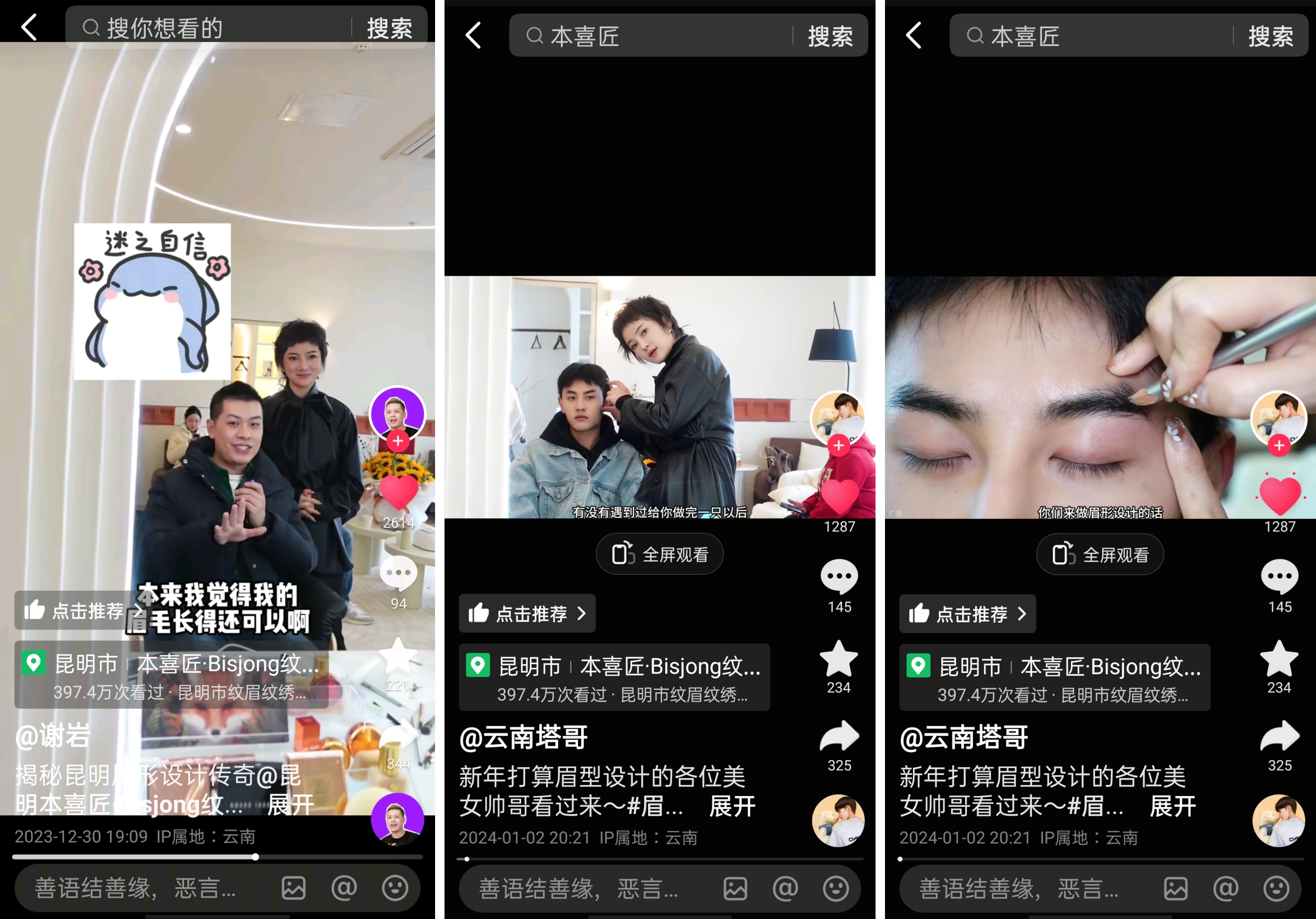 跑通了“人找店”之后,不止是云南本地,還有不同城市、不同年齡的客人專程而至。有位深圳的粉絲,給身邊姐妹們都種草了本喜匠,組團飛來昆明,順便旅游和紋眉。還有位50歲的阿姨,一到門店就說自己又想紋眉又不敢,在家把本喜匠的短視頻看了又看,最后還是決定先來試試。