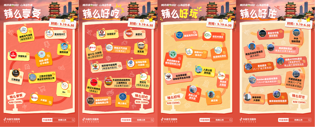 南昌,這座承載著“紅色故都”與“生態(tài)水城”雙重基因的城市,近日迎來了一場以“贛味美食、生態(tài)美景、歷史文化”為核心的消費熱潮。抖音生活服務(wù)“城市奔赴計劃-熱辣江西”活動,結(jié)合端午、六一等節(jié)點熱點,通過線上線下多元玩法,成功激活春夏消費市場,掀起一場“熱辣”風(fēng)暴。